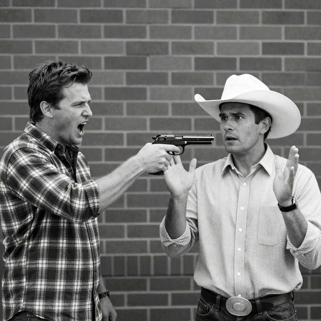 Black-and-white photograph of two men in front of a brick wall. The man on the left, wearing a plaid shirt, points a gun at the man on the right, who wears a cowboy hat and buttoned shirt, with his hands raised. The left man's mouth is open in a shout, and the right man looks surprised.
