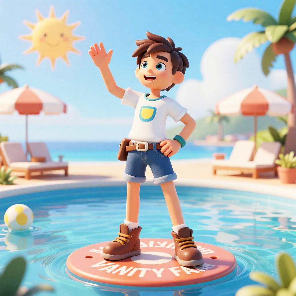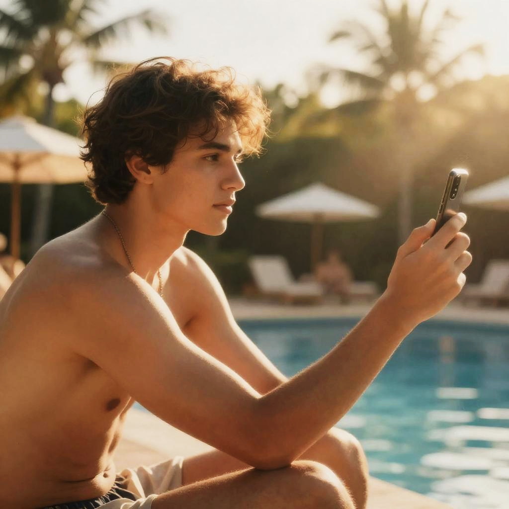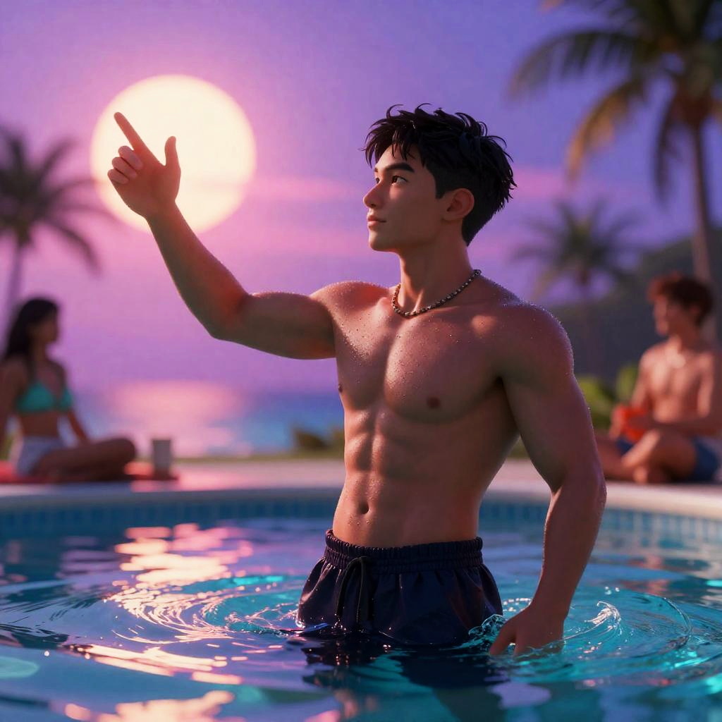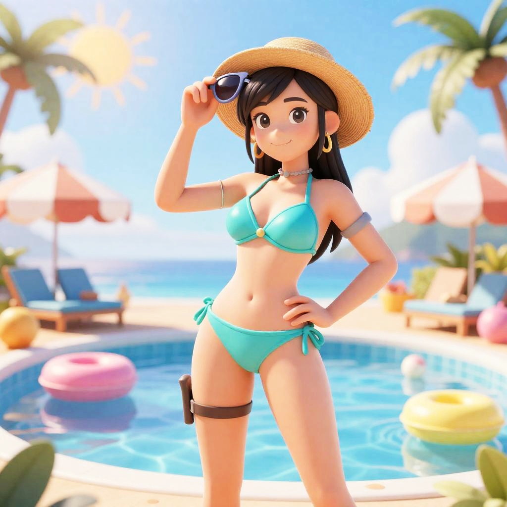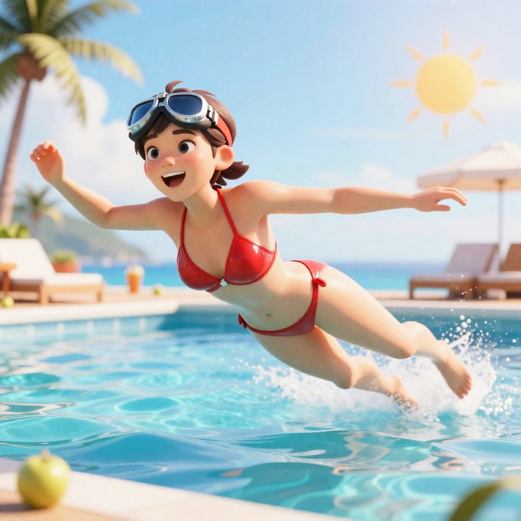 Pool party with original poolside influencer — athletic adult female, sun-kissed skin, short bob haircut, neon sporty swimsuit, sunglasses perched on head, holding a cold drink catching the Caribbean sun, photorealistic cinematic 35mm film look with warm golden-hour volumetric lighting and shallow depth of field, Octane Render, Unreal Engine 5, trending on ArtStation