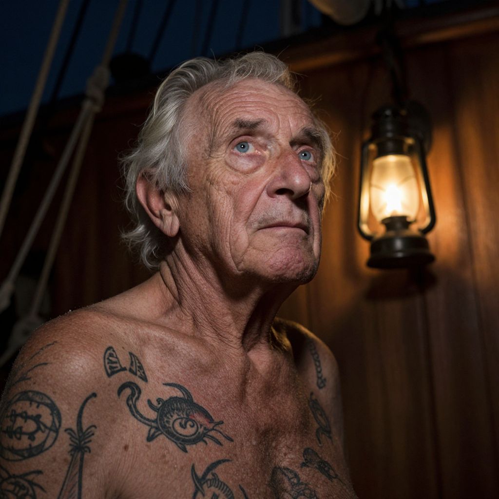 Envision a photorealistic portrait of an elderly man, his face etched with deep wrinkles, captured from a low-angle perspective as if gazing up at him from below deck. His eyes, hazy blue, hold a weary yet resilient gaze, illuminated by the soft glow of dim lantern light. The surrounding environment is bathed in flickering candlelight, casting elongated shadows that dance across intricate tattoos depicting sea creatures and ancient nautical symbols on his skin. As the gentle creaking of the ship's timbers echoes through the air, this portrait conveys a sense of adventure, solitude, and the passage of time within the intimate world of the old sailor.