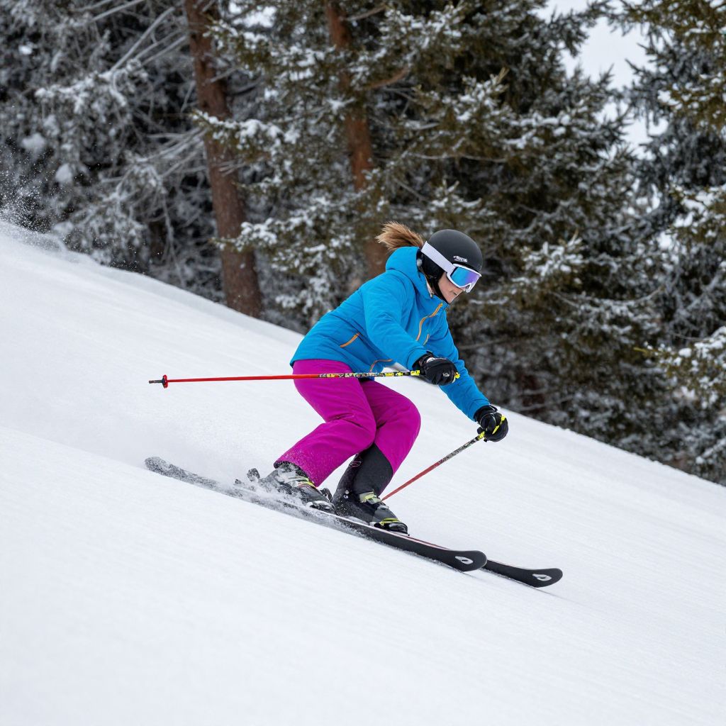 Skiing woman glides gracefully downhill, her vibrant blue jacket and magenta pants contrasting against the snowy landscape, as she maneuvers with precision using two red ski poles amidst a backdrop of snow-covered evergreen trees.