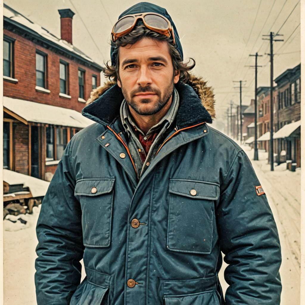 Photo of a Rugged Build man, Wave, winter outfit, turndown collar parka with lining and ribbed mitts, vintage postcard depiction