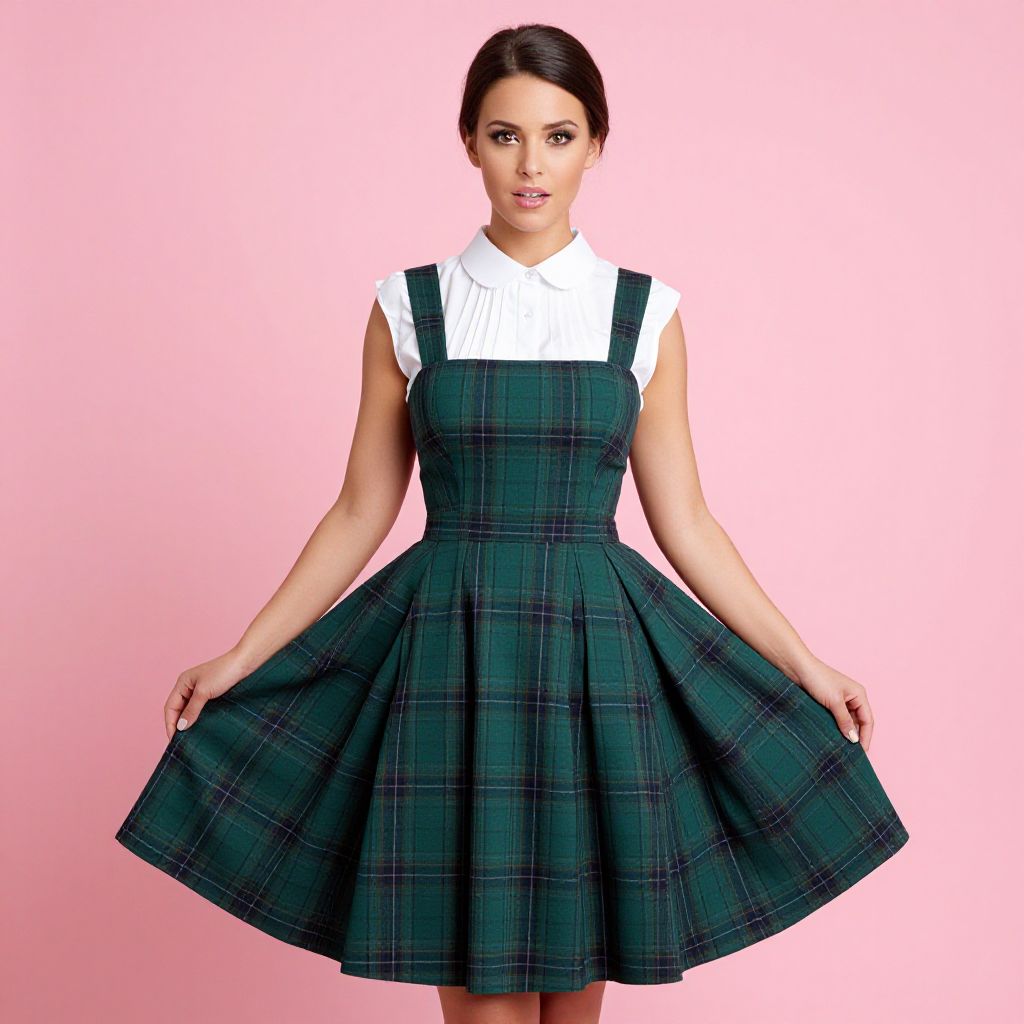 "Woman, retro-inspired, green tartan pinafore dress with a full circle skirt, knee-length, white Peter Pan collared blouse underneath, sleeveless dress design, simple hairstyle with middle-parted hair, pink studio background.. Sexy. Pretty face and beаutiful eyes. Big breasts."