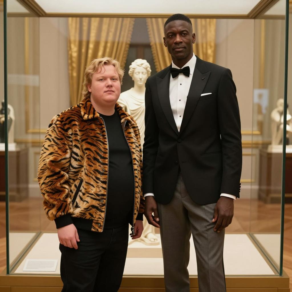Portrait of two men standing indoors in front of a glass-encased display with classical statues and gold curtains in the background. The man on the left is overweight with light skin and blond hair, wearing a tiger-print jacket and black pants. The man on the right is tall with dark skin, dressed in a black tuxedo jacket, white shirt with black bow tie, and gray pants. The environment suggests a museum or gallery setting.
