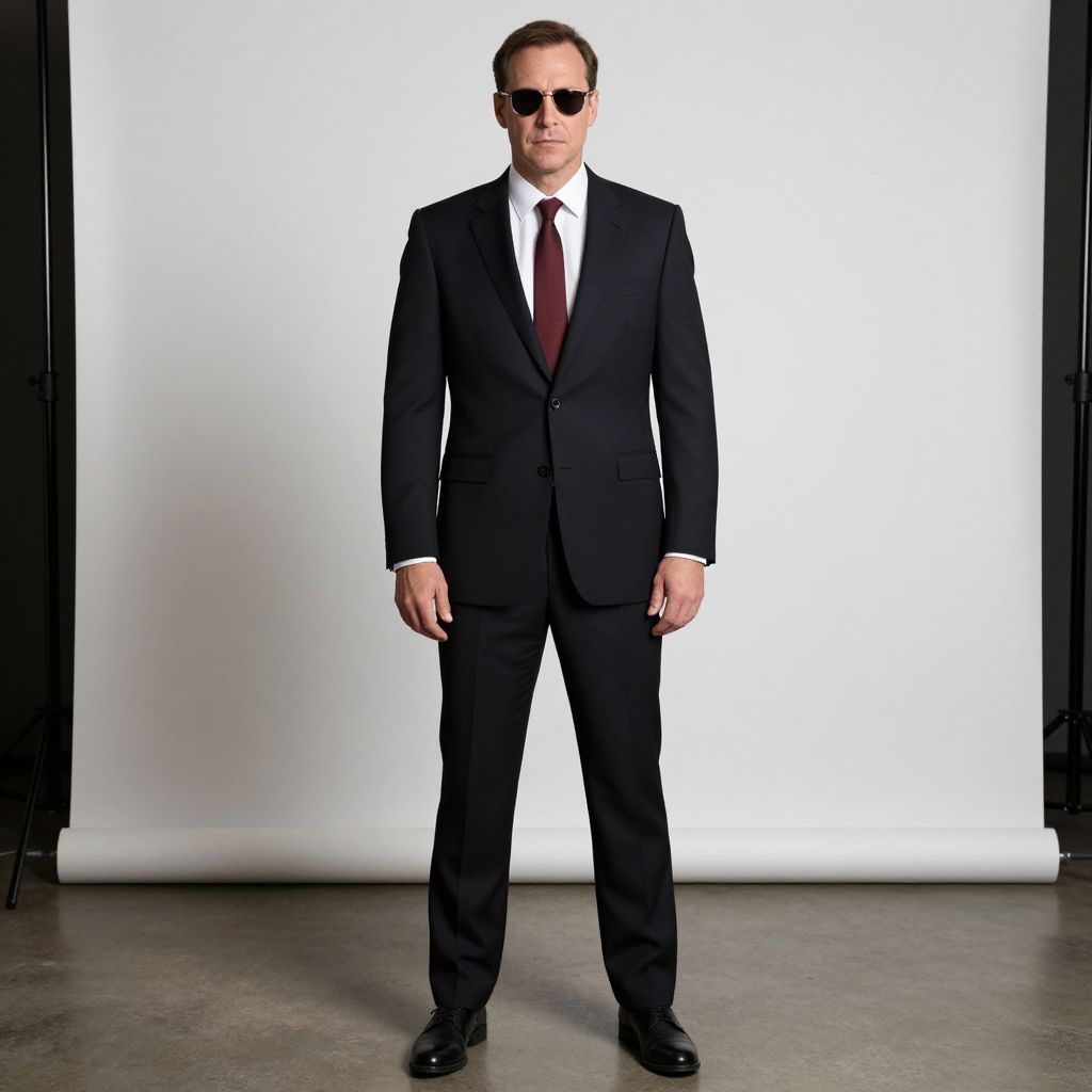 Photograph of a Caucasian man with short brown hair, wearing dark sunglasses, a black suit, white dress shirt, and a maroon tie. He stands confidently against a plain white backdrop with black vertical borders on either side, on a gray concrete floor. His stance is straight, hands relaxed by his sides. The lighting is even, highlighting his formal attire and serious expression. The overall style is clean and professional, suggesting a business or promotional setting.