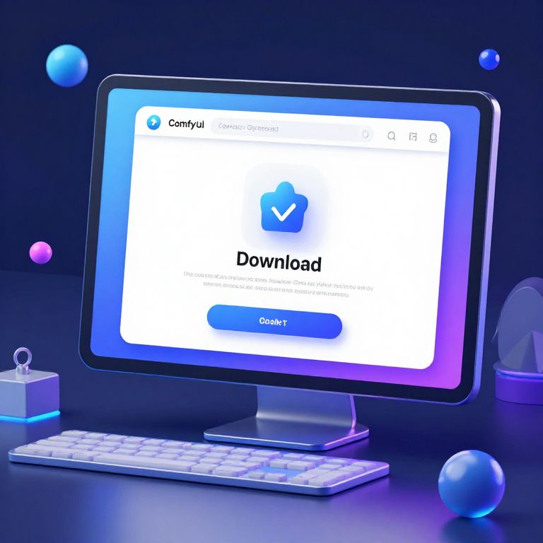 ComfyUI download interface displayed on a sleek futuristic computer screen, vibrant digital elements floating around, smooth user experience design, glowing neon accents, highly detailed tech environment, modern UI/UX, soft blue and purple color palette.