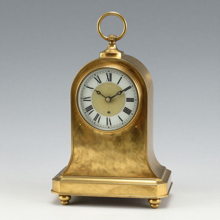 Photograph of a vintage, gold-painted, arched clock with black Roman numerals, white face, and a ring handle on top.