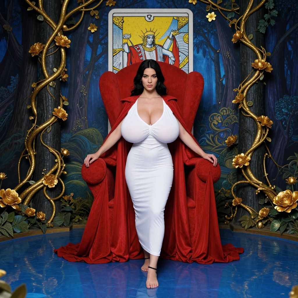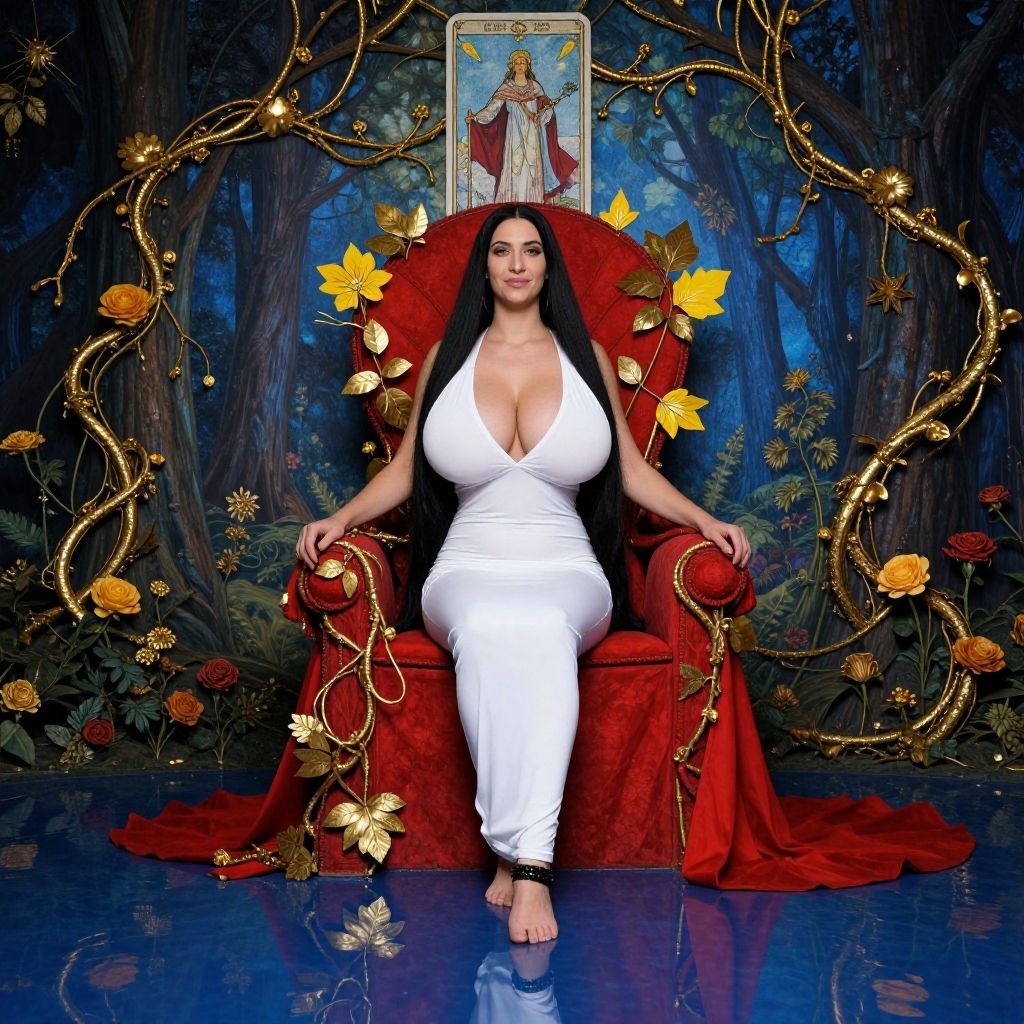 (goddess:1.4), full body, black hair, white dress, blue floor, large breasts, barefoot, simple dress, solo, blue and white color palette, long hair, leaves, deity, extremely beautiful woman, vines, golden flowers, garden, gold vines, black foot bracelet, dark blue, (best quality:1.4), gigantic breasts, (high res:1.3), (high quality:1.4), cleavage, (masterpiece, best quality), (1girl:1.4), (solo:1.4), (empress:1.3), (golden cape:1.4), tarot card style, (roses, vines), dark theme, (full body), (garden:1.2), realistic light, red and yellow color palette, goddess, (detailed background:1.4), (red floor:1.4)