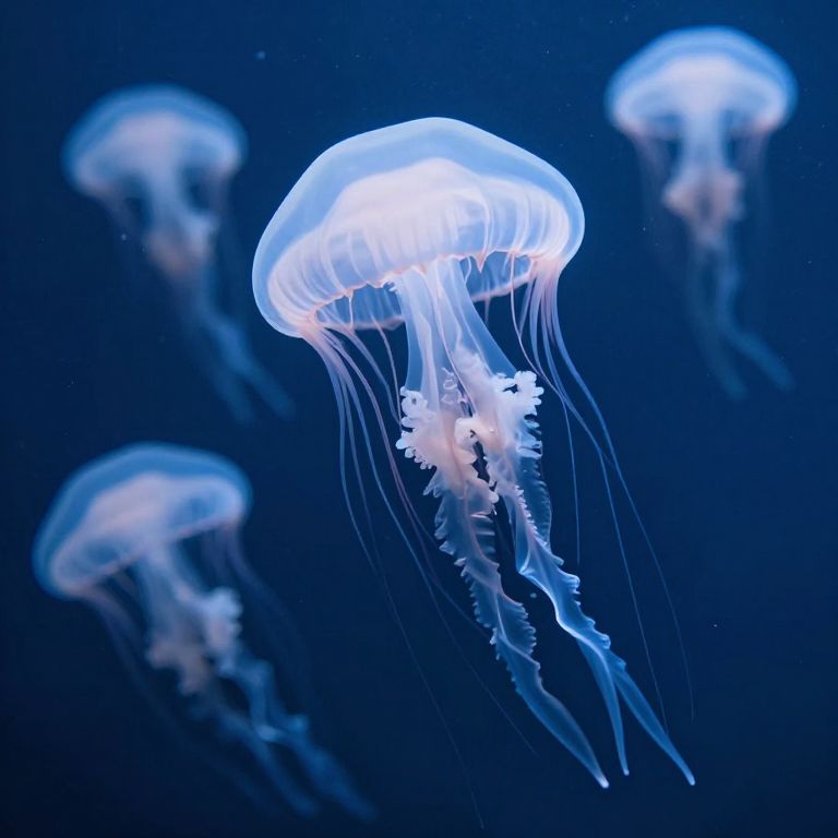Photograph of four glowing jellyfish in a dark blue underwater scene. The central jellyfish is brightly illuminated with a translucent white bell and delicate, flowing blue-tinted tentacles. Three other jellyfish are blurred in the background, creating a sense of depth. The jellyfish have intricate, frilled structures near their bases and ethereal, almost bioluminescent appearance. The dark blue background contrasts sharply with the jellyfish's luminous bodies, highlighting their delicate, otherworldly beauty.