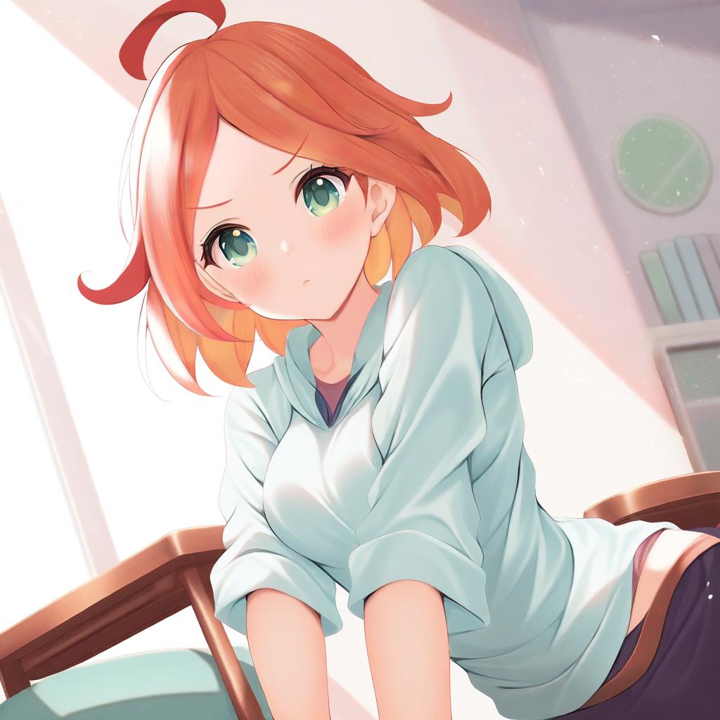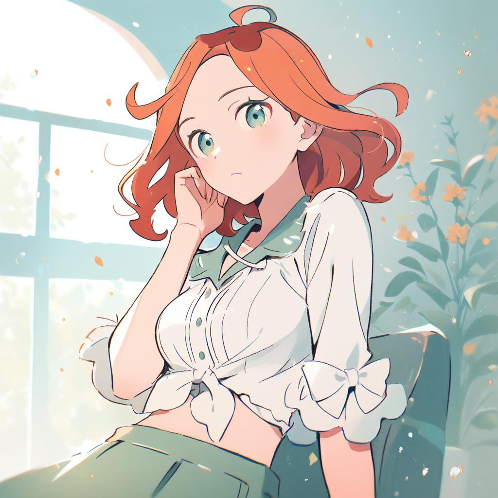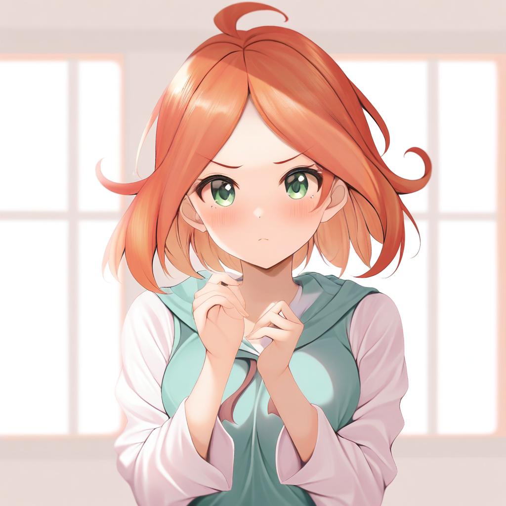 Illustration of an anime-style girl with short two-tone orange and red hair, green eyes, and an ahoge. She wears a light green dress over a pale pink t-shirt and stands indoors near a window with sunlight streaming in, showcasing medium-sized breasts and a serious expression.