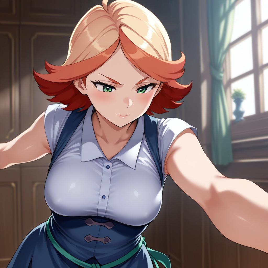 Amanda o'neill, little witch academia, 1girl, green eyes, short hair, orange hair, two-tone hair, red hair, ahoge, medium breasts, by artist minato ojitan, animagine