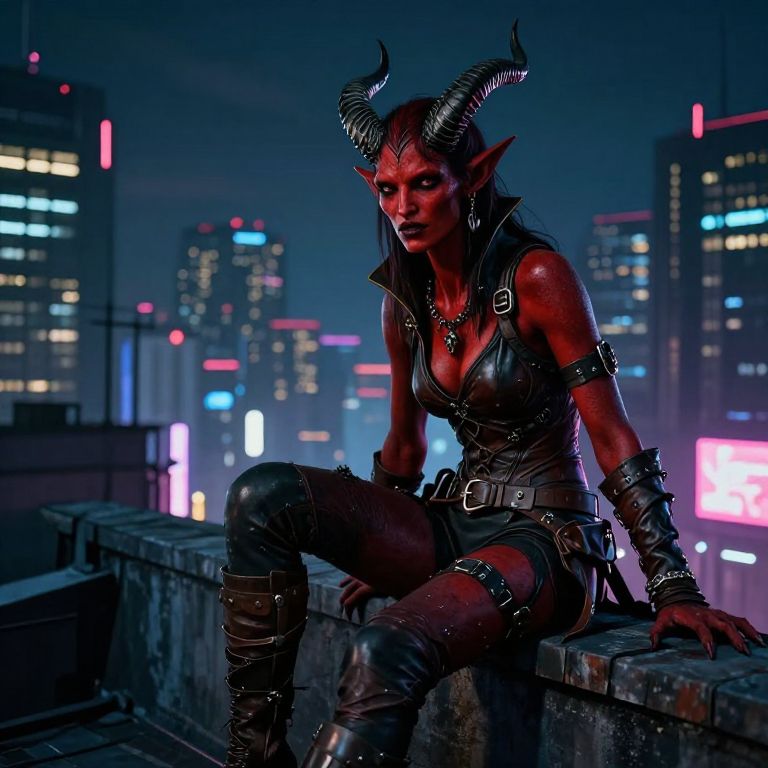 This digital CGI image features a red-skinned, demon-like woman with large, black, spiral horns and pointed ears, sitting on a rooftop at night. She has a muscular build, wearing a black, leather, sleeveless top with a deep neckline, revealing ample cleavage, and matching leather shorts. She also has black, fingerless gloves and thigh-high boots. Her skin has a textured, slightly shiny appearance. The background shows a cityscape with brightly lit, neon-colored buildings in blue, pink, and white, creating a cyberpunk atmosphere. The woman's intense gaze is directed forward, and her posture is confident and commanding.