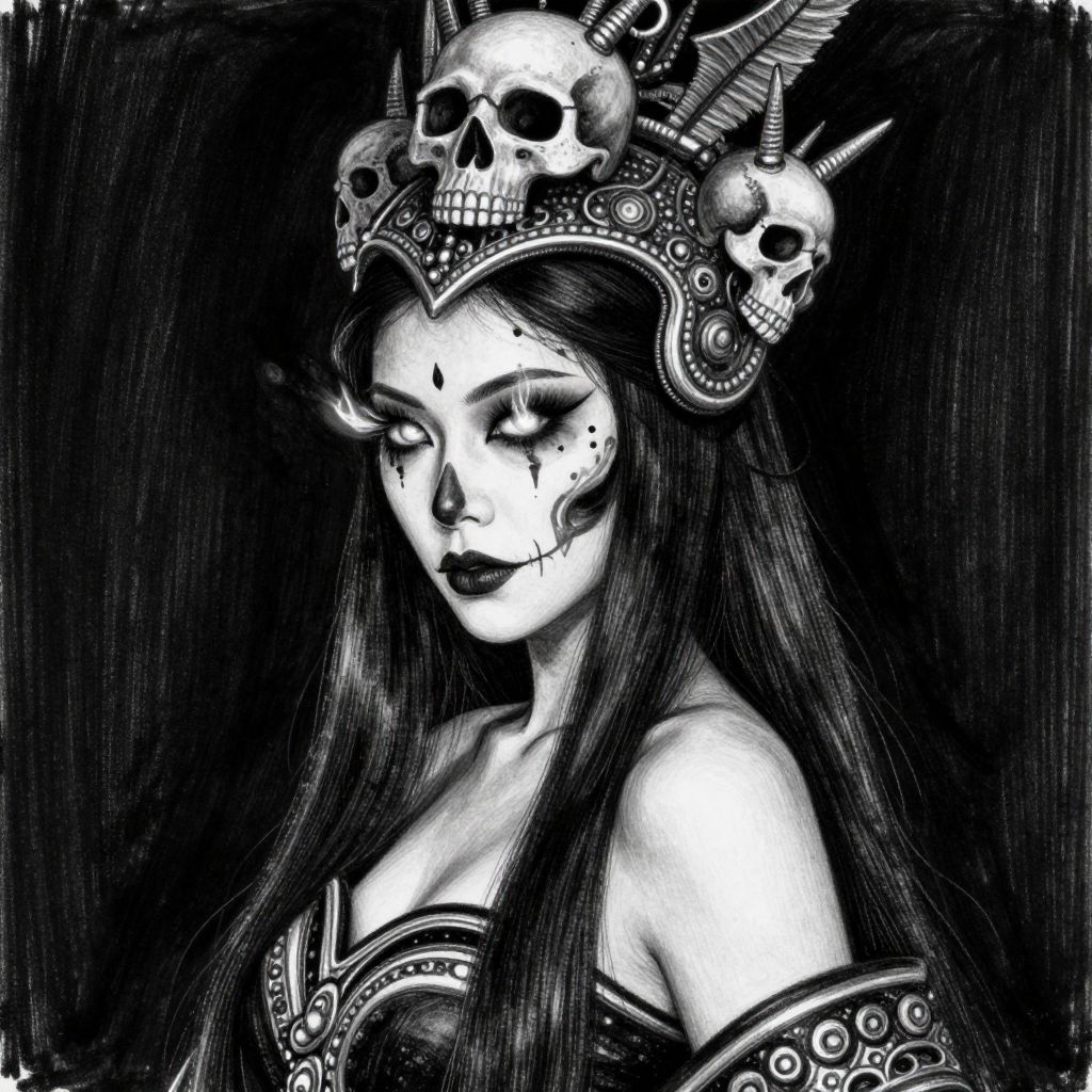 Monochrome digital drawing of a gothic woman with long hair, skull-adorned crown, dark lipstick, and intricate arm jewelry, eyes closed,