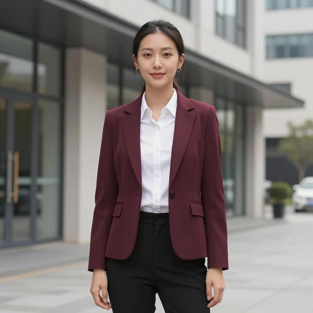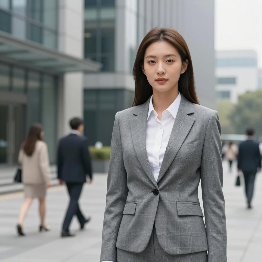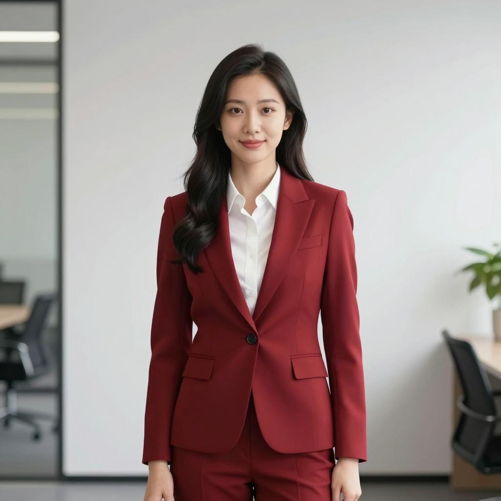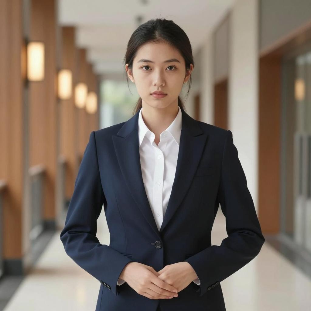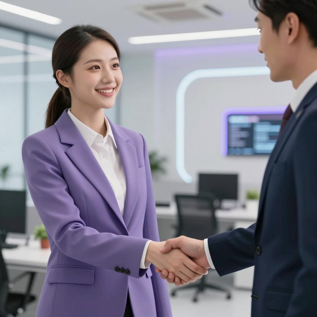 Two Asian business professionals shaking hands in a contemporary office environment. The woman is dressed in a purple blazer over a white shirt, smiling confidently. The man is wearing a dark blue suit and white shirt. The setting features sleek office furniture and digital displays with futuristic lighting accents.