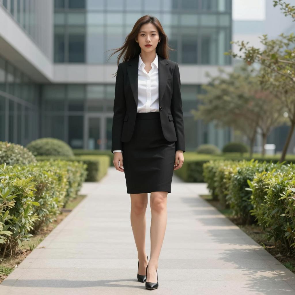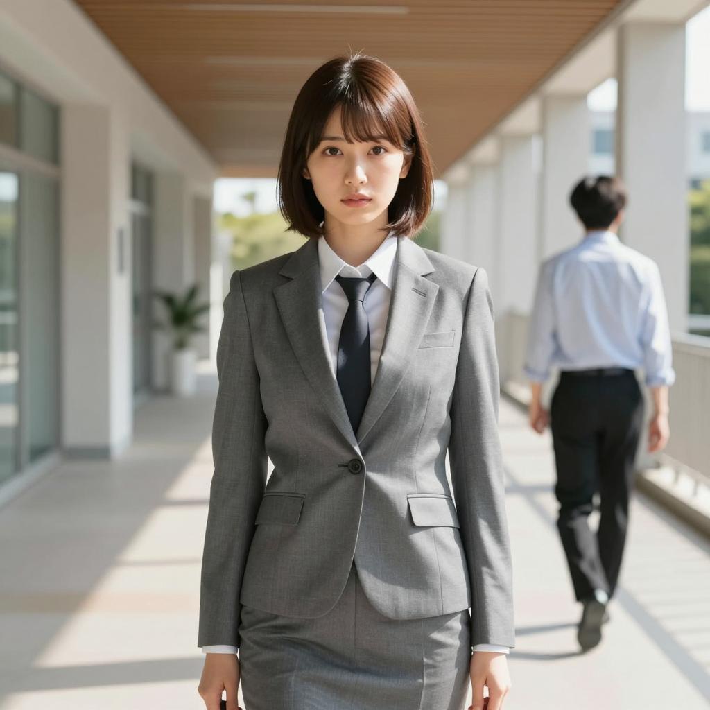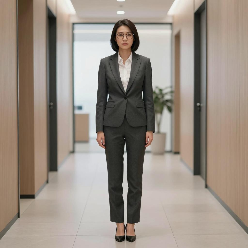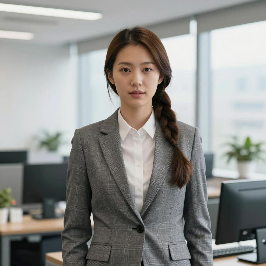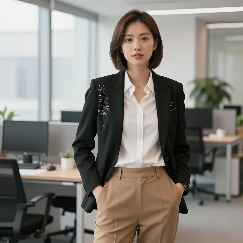 Two Asian business professionals shaking hands in a contemporary office environment. The woman is dressed in a purple blazer over a white shirt, smiling confidently. The man is wearing a dark blue suit and white shirt. The setting features sleek office furniture and digital displays with futuristic lighting accents.