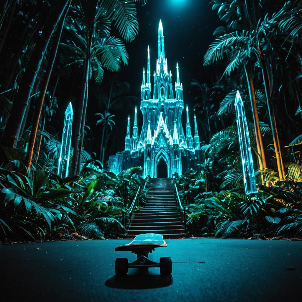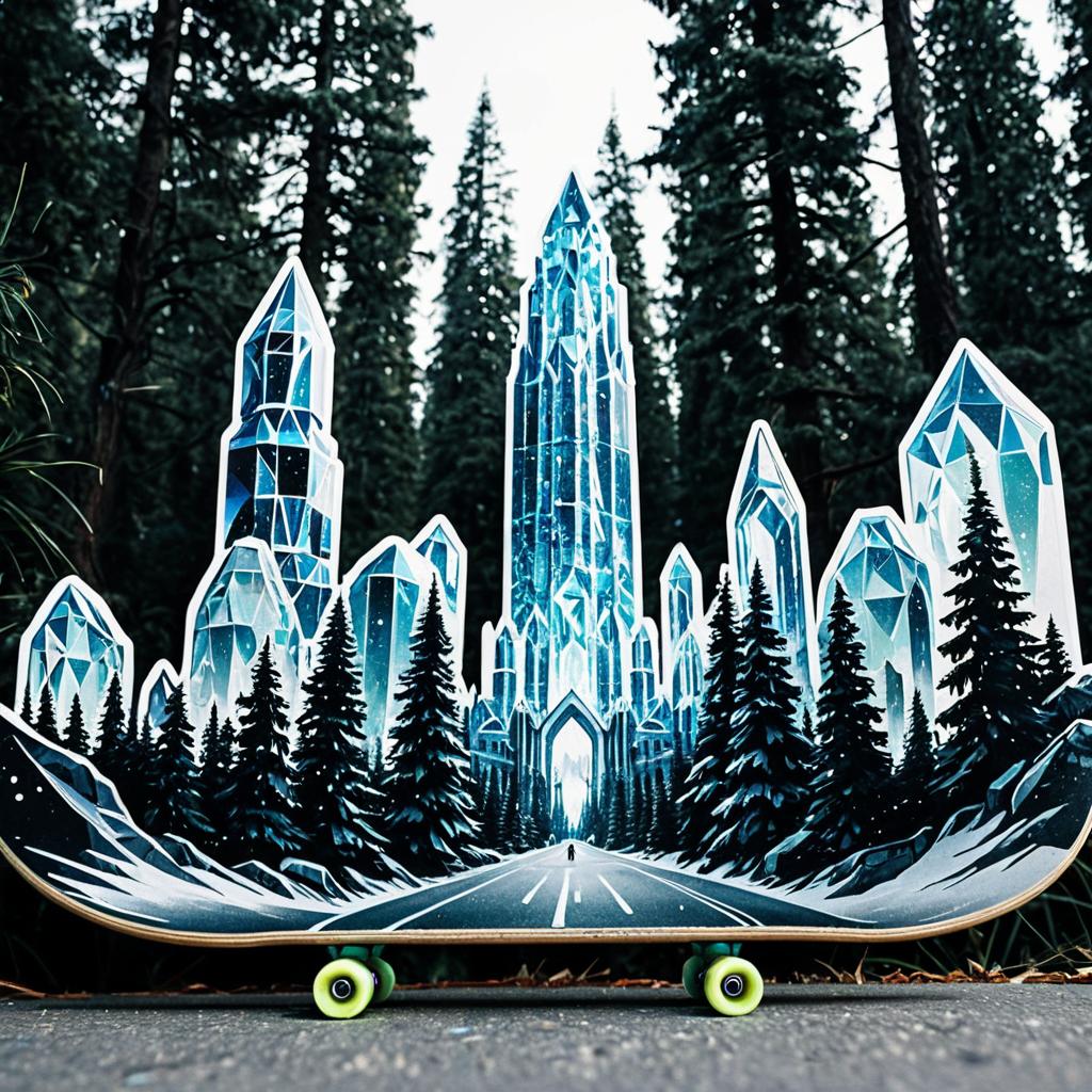 Skateboard Sticker create a scene for a fantastic, beautiful and amazing world, sparkling crystal forests with gem-encrusted trees, magnificent towers formed from giant crystals and light, very big and wide, wide view that allows you to observe the whole scene, hyper realism, extreme quality, movie quality, 8k, extraordinary details, extremely real