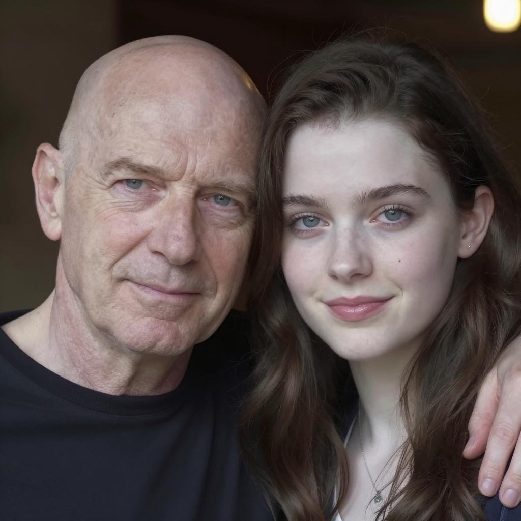 Photograph of an older bald man and a young woman with pale skin and dark brown hair. They are smiling closely together. The man is on the left, the woman on the right. Dimly lit background. Woman's right arm around the man's shoulder.