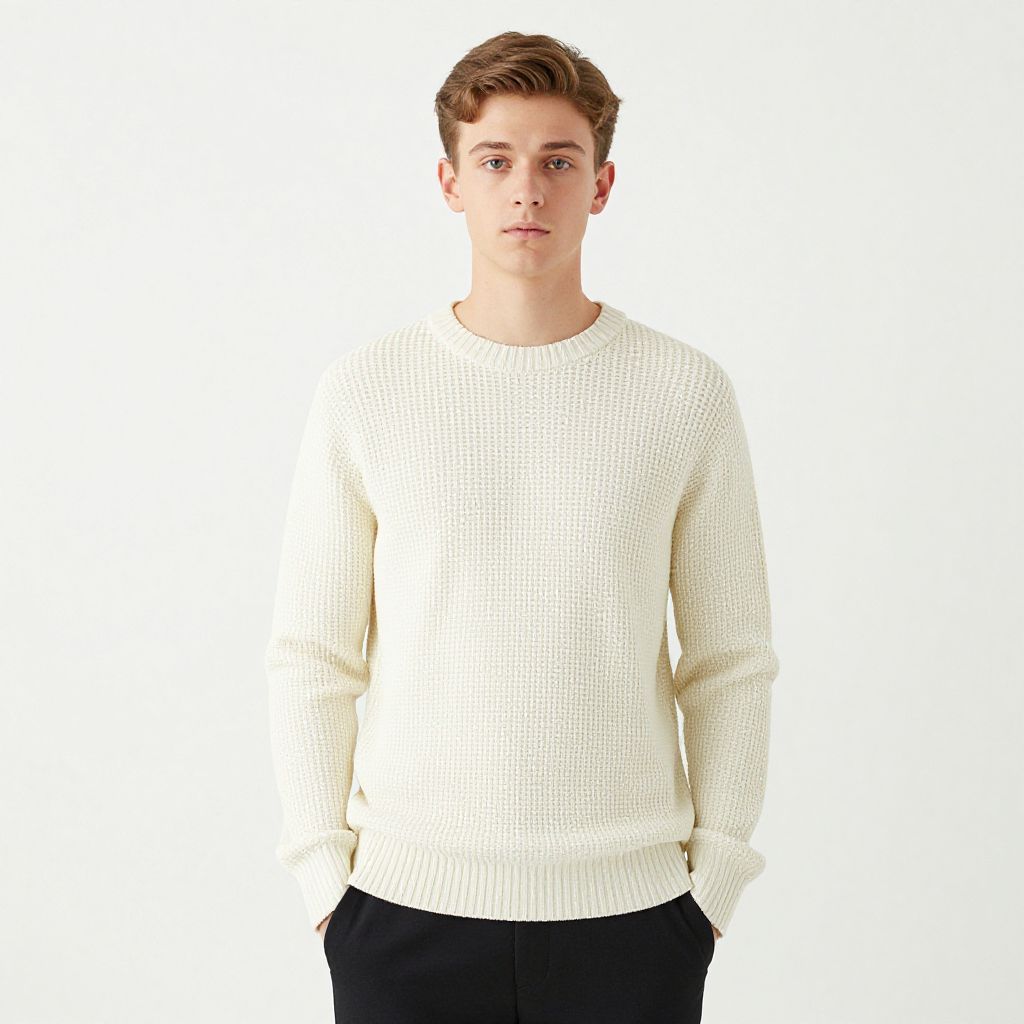 Photograph of a young Caucasian man with short, brown, wavy hair and fair skin, standing against a pure white background. He is wearing a white, knitted sweater with a crew neck and black pants. His hands are in his pockets, and he is looking directly at the camera with a neutral expression. The sweater has a subtle textured pattern, and the overall lighting is bright and even, emphasizing the simplicity and clean lines of the image.
