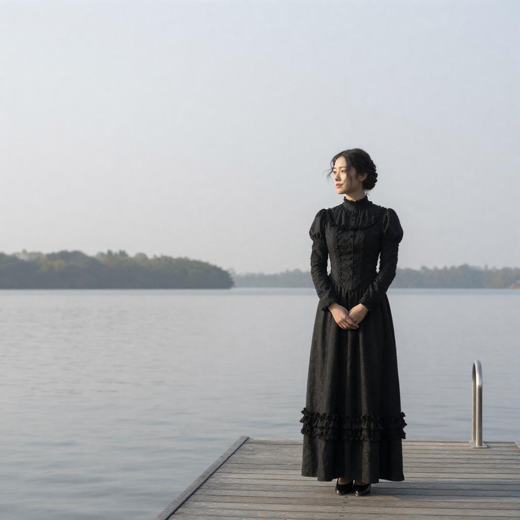 Photograph of a woman in a long, black, Victorian-style dress standing on a wooden dock by a calm lake. She gazes into the distance with her hands clasped in front. The dock has a metal ladder on the right, and the lake stretches out to a distant treeline under a bright, overcast sky.