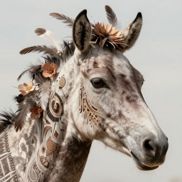 Close-up of Equus head and neck adorned with intricate tribal markings and natural elements like feathers and flowers, soft natural light casting delicate shadows, artistic portrait style that blends realism with decorative fantasy elements, detailed and emotive.