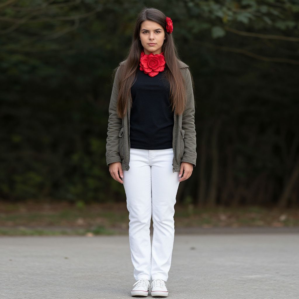 Photograph of a young woman with long, straight, dark brown hair, wearing a red rose-shaped scarf, black top, olive green jacket, and white pants. She has a red flower in her hair and white sneakers. She stands on a gray pavement with a dark, leafy background. Her expression is neutral, and she stands centrally in the frame, facing the camera. The lighting is natural, highlighting her outfit against the dark background.