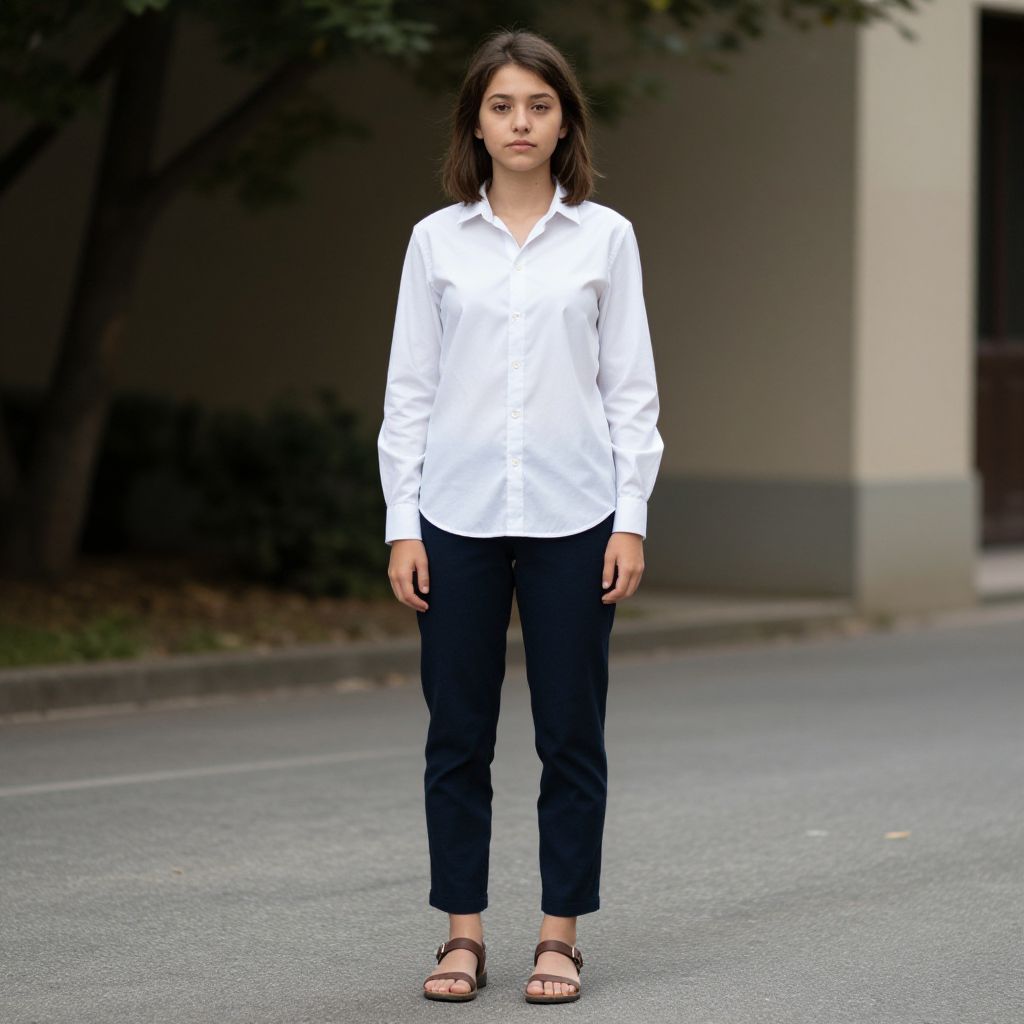 Photograph of a young woman with long dark hair, wearing a red rose scarf, black top, olive green jacket, white pants, and white shoes