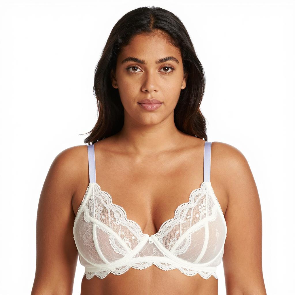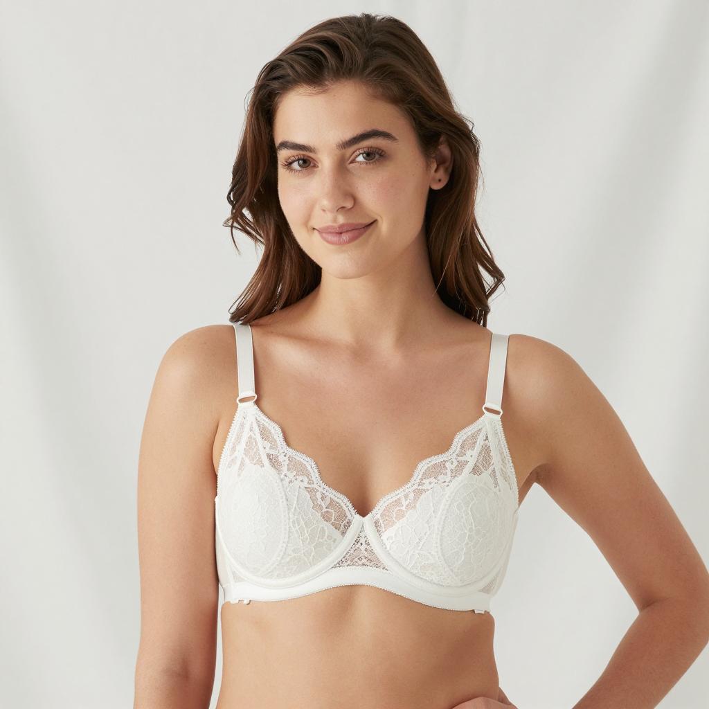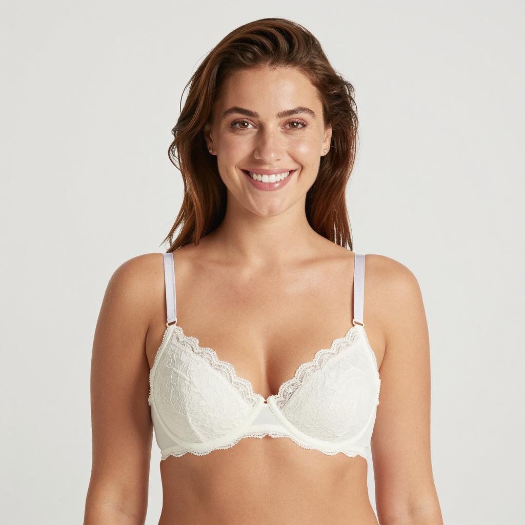 Young woman with light skin and long brown hair, wearing a white lace bra with padded cups. She looks to the right, with a slight smile. Background is plain white. Bra has thin straps and floral lace patterns. Her arms rest at her sides.