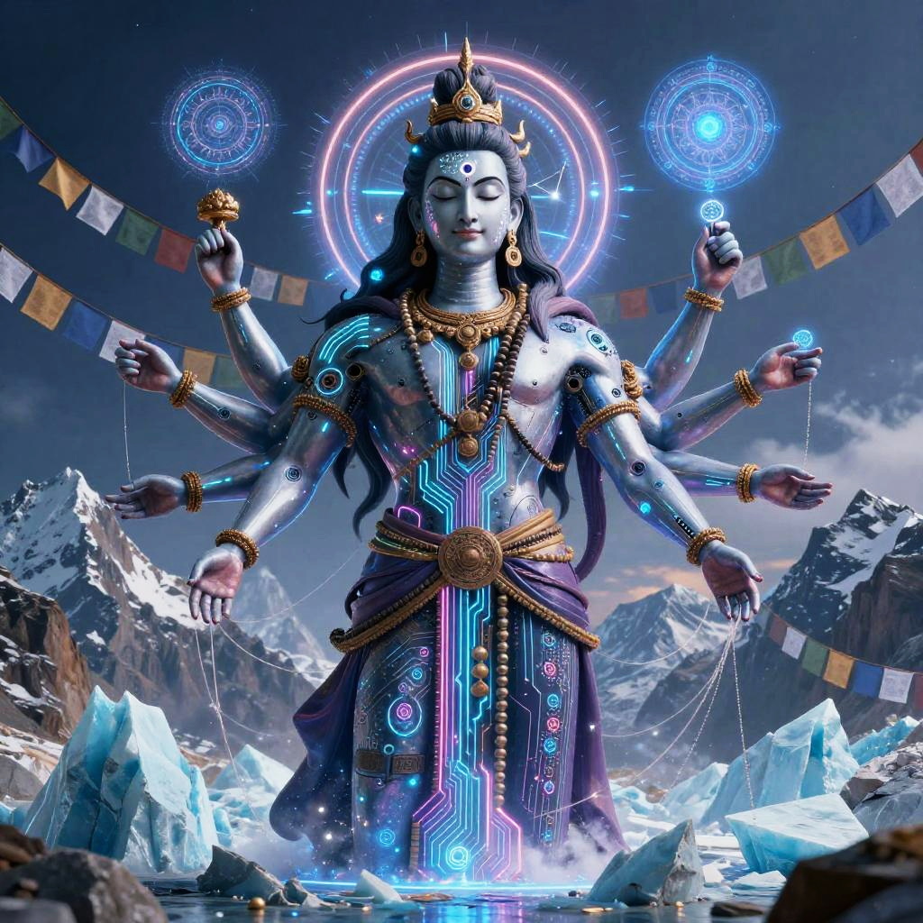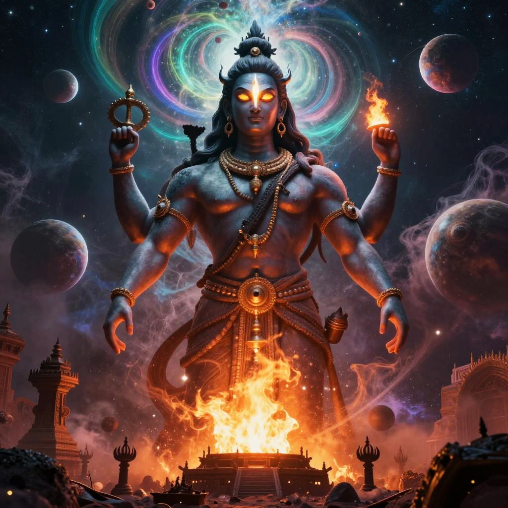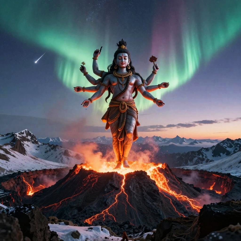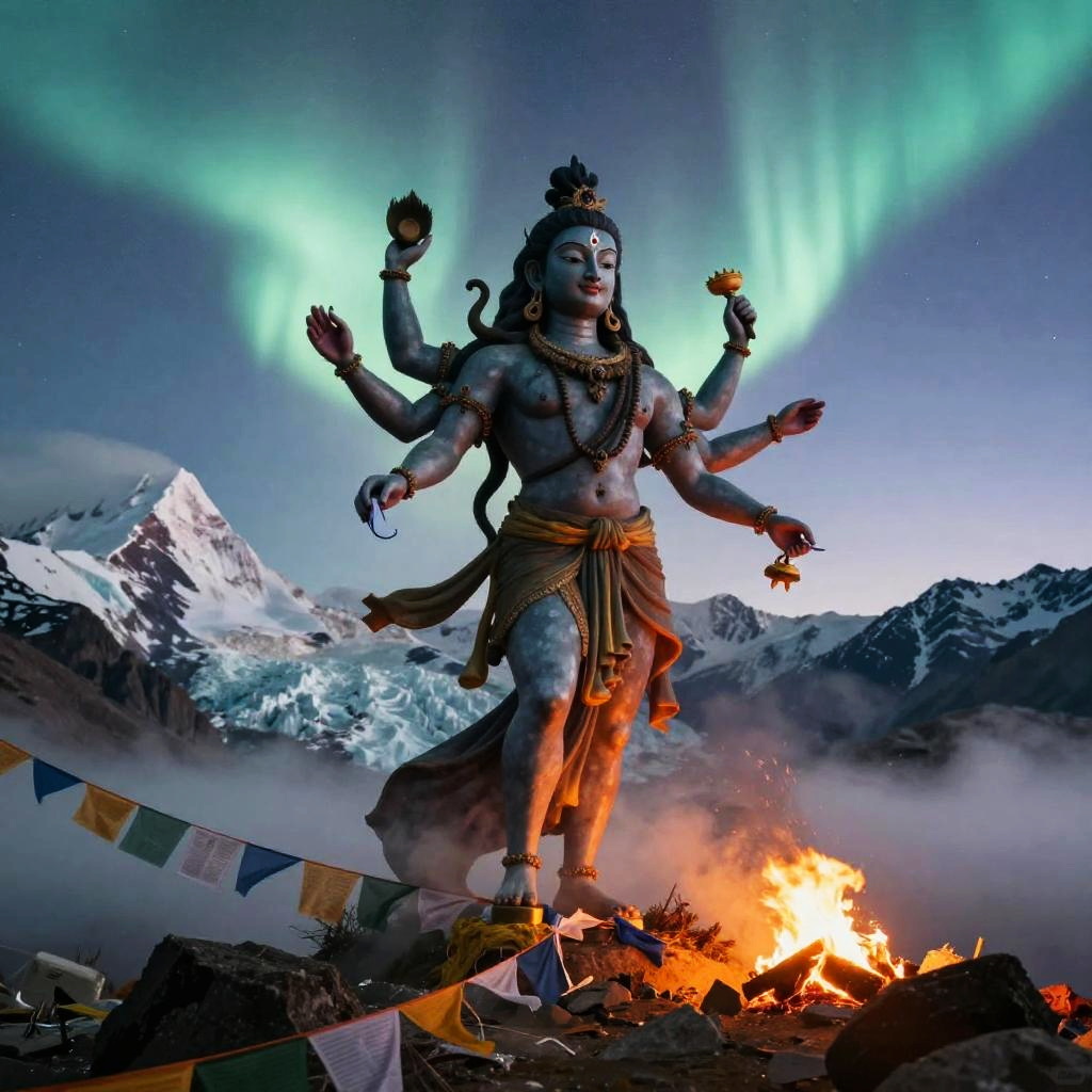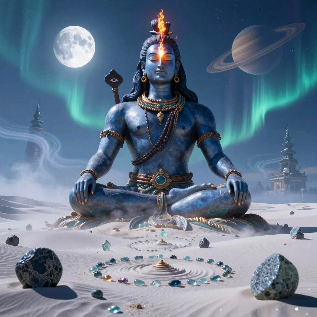 Shiva – The destroyer and god of transformation, shown as a cosmic dancer performing the Tandava, standing in a high-altitude sapphire desert beneath twin moons and a distant ringed planet, dunes of glassy sand dotted with wind-sculpted prayer stones and drifting auroral veils