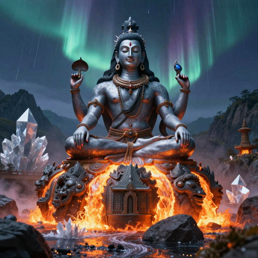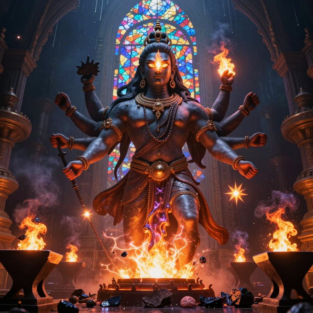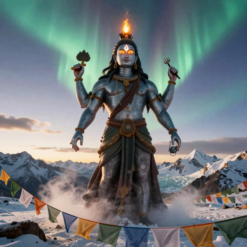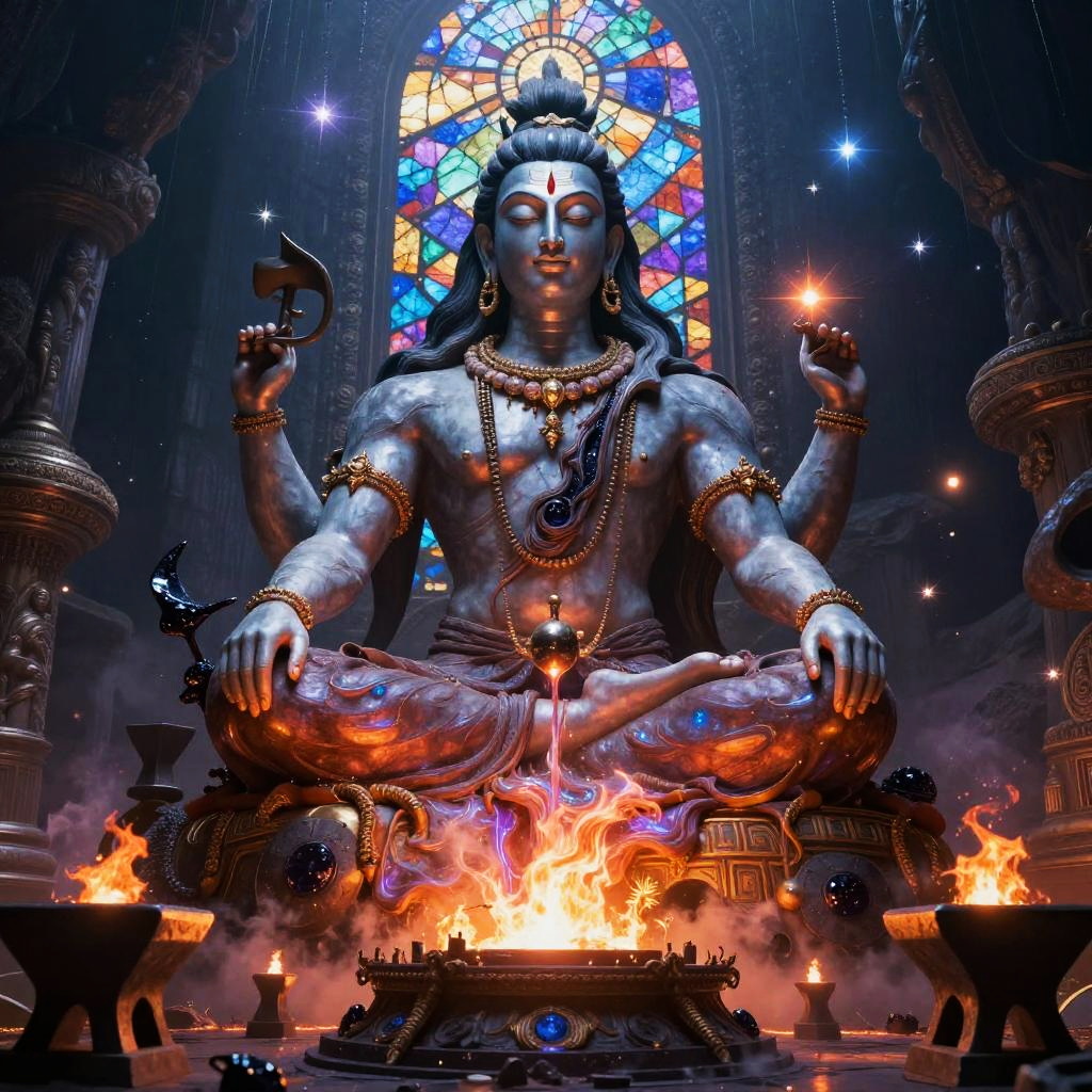 Shiva – The destroyer and god of transformation, shown as a cosmic dancer performing the Tandava, standing in a high-altitude sapphire desert beneath twin moons and a distant ringed planet, dunes of glassy sand dotted with wind-sculpted prayer stones and drifting auroral veils
