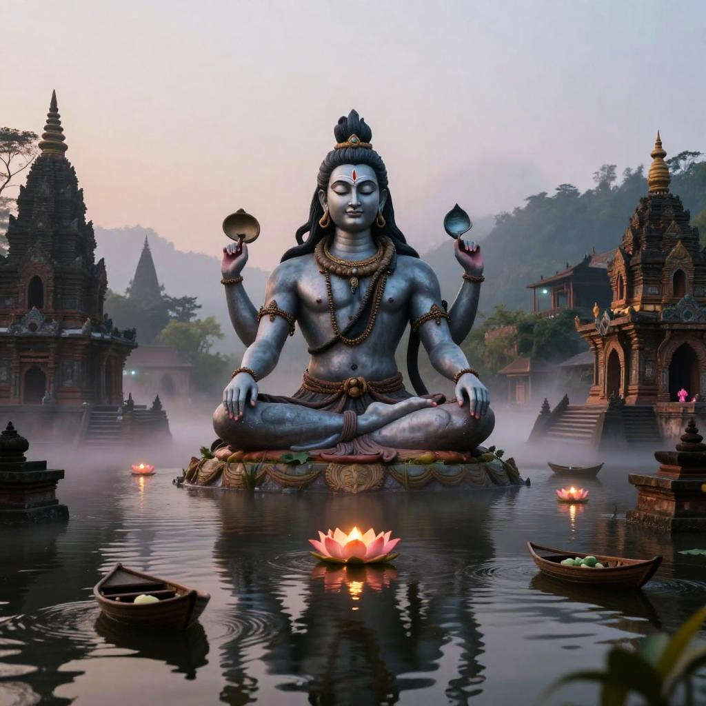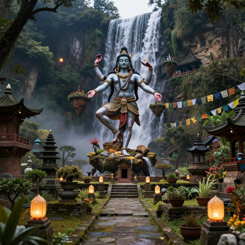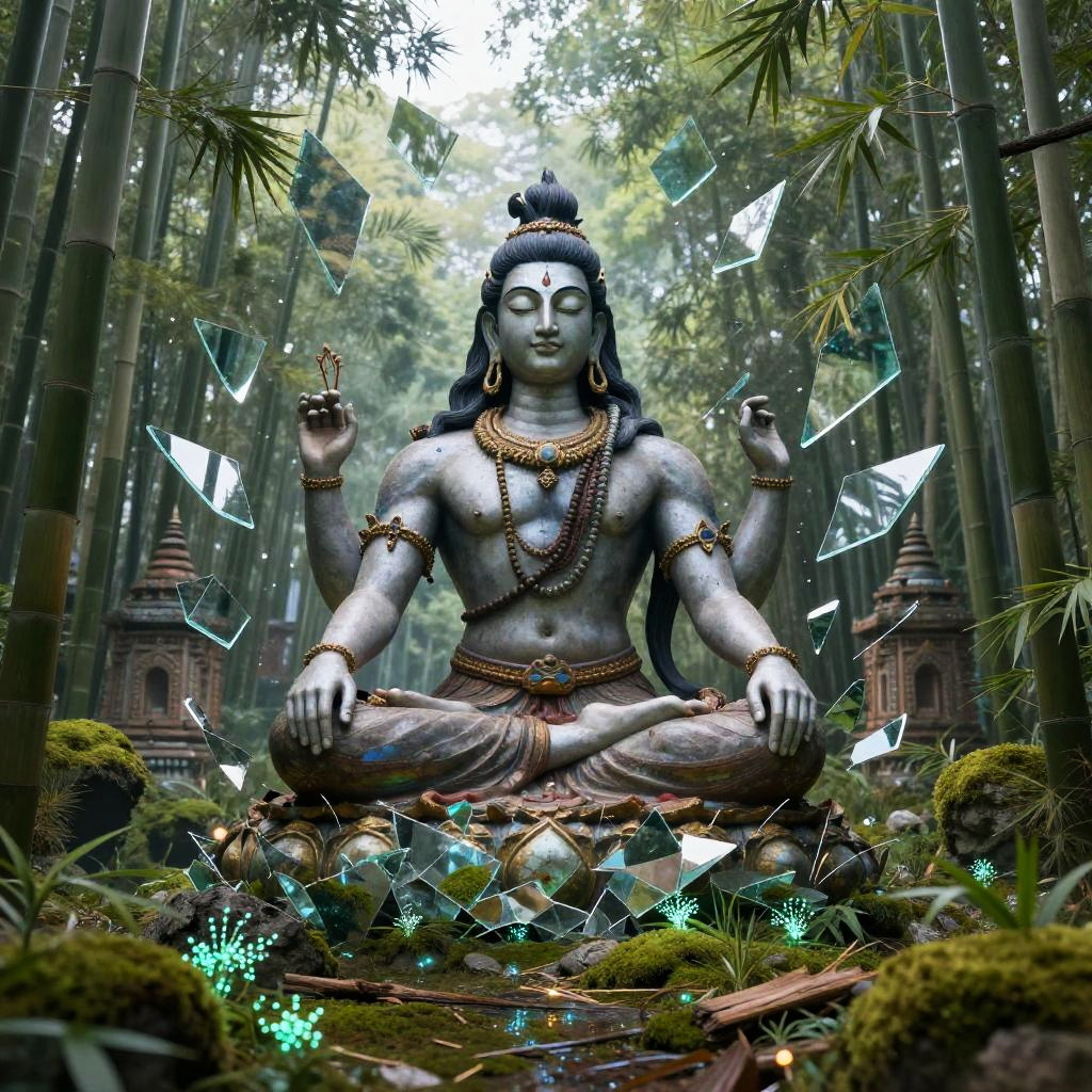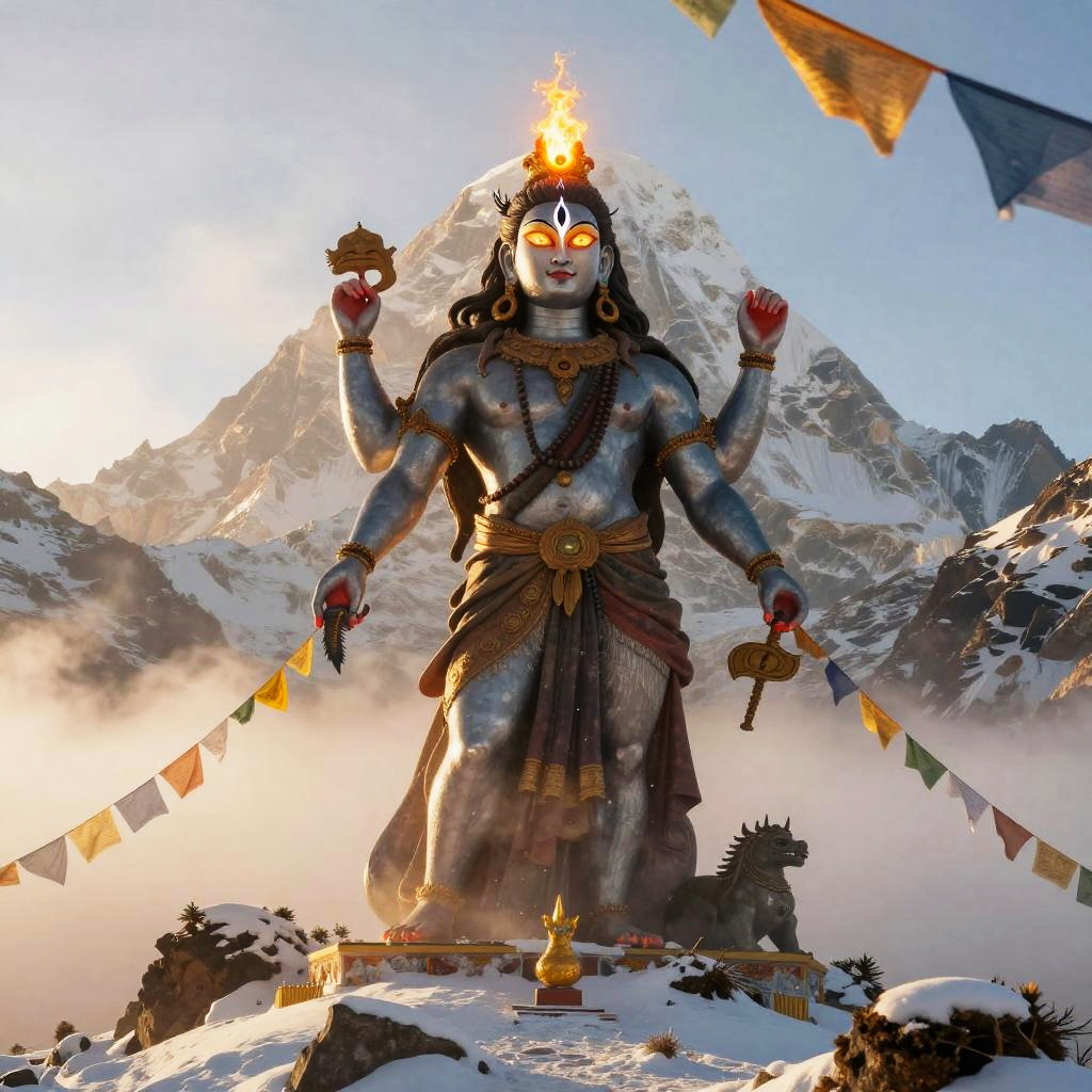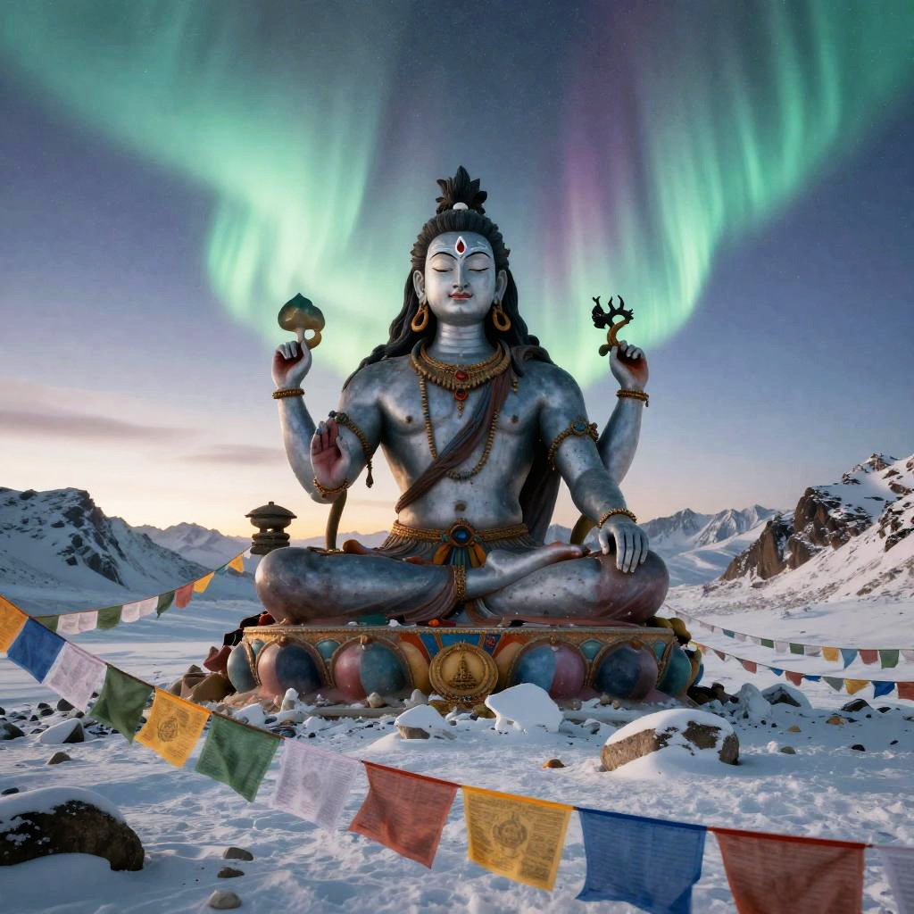 Shiva – The destroyer and god of transformation, shown as a cosmic dancer performing the Tandava, standing in a high-altitude sapphire desert beneath twin moons and a distant ringed planet, dunes of glassy sand dotted with wind-sculpted prayer stones and drifting auroral veils