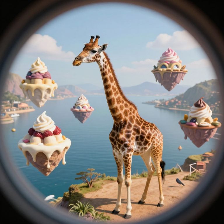 Envision an enchanting dreamscape where a graceful giraffe with shimmering fur stands amid drifting isles of melting sundae landscapes. From a bird's vantage point, we witness this whimsical tableau, as though peering through a prism lens, capturing the interplay of dreamlike hues and textures. This unique viewpoint fuses surrealism with an unexpected fauna element, invoking a sense of awe and intrigue in the observer while transporting them to a magical realm that mingles reality and fantasy.