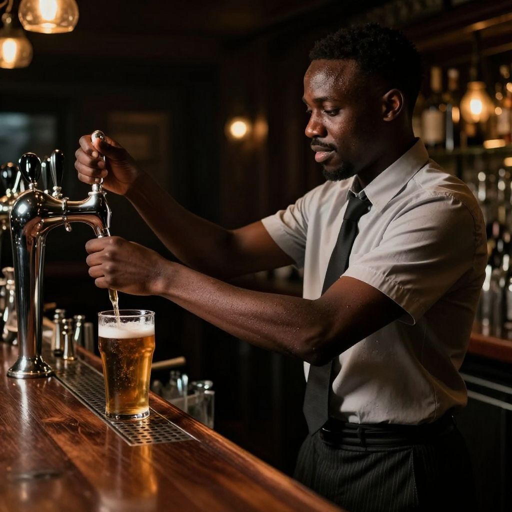 Photograph of a dark-skinned male bartender with short curly hair, wearing a white short-sleeved shirt and black tie, pouring beer from a tap into a glass. The glass of beer, filled with amber liquid and a foamy head, is placed on a wooden bar counter. The background is dimly lit with warm, glowing lights, creating a cozy, intimate atmosphere. Bar tools and another tap are visible on the counter. The bartender's focused expression and the detailed texture of his shirt and the wooden bar enhance the image's realism.