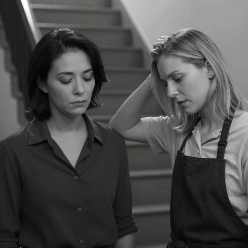 Black and white photograph featuring two women indoors with serious expressions. The woman on the right has dark hair styled in an updo and wears a black cardigan over a white blouse, standing and looking downward. The woman on the left has short light-colored hair, wears a plaid shirt, and kneels looking upward. The background includes a wooden dresser topped with framed photos and subtle patterned wallpaper, highlighting a close, intense gaze between the subjects.