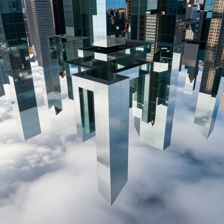 A labyrinth of floating mirrors reflects inverted versions of cities above and beneath the clouds, where gravity diverges with every turn.