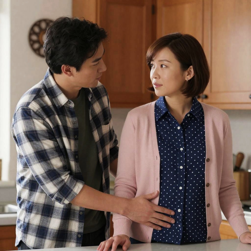 Photograph of a man and woman in a kitchen. Man with dark hair, plaid shirt, leaning in, hands on woman's waist. Woman with short brown hair, pink cardigan, blue polka-dot shirt, standing, looking at man. Wood-paneled cabinets, decorative wall hanging in background. Man's face shows focus, woman's face shows calm. Woman's right hand rests on counter. Light from left.