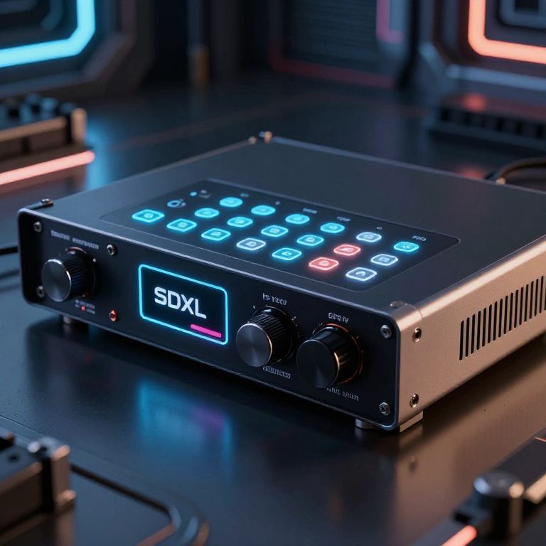 A close-up of sdxl best sampler device with an illuminated control panel, futuristic design elements, sleek black and silver alloy materials, ambient neon lighting casting reflections, set against a high-tech industrial backdrop, hyperrealistic, cinematic lighting