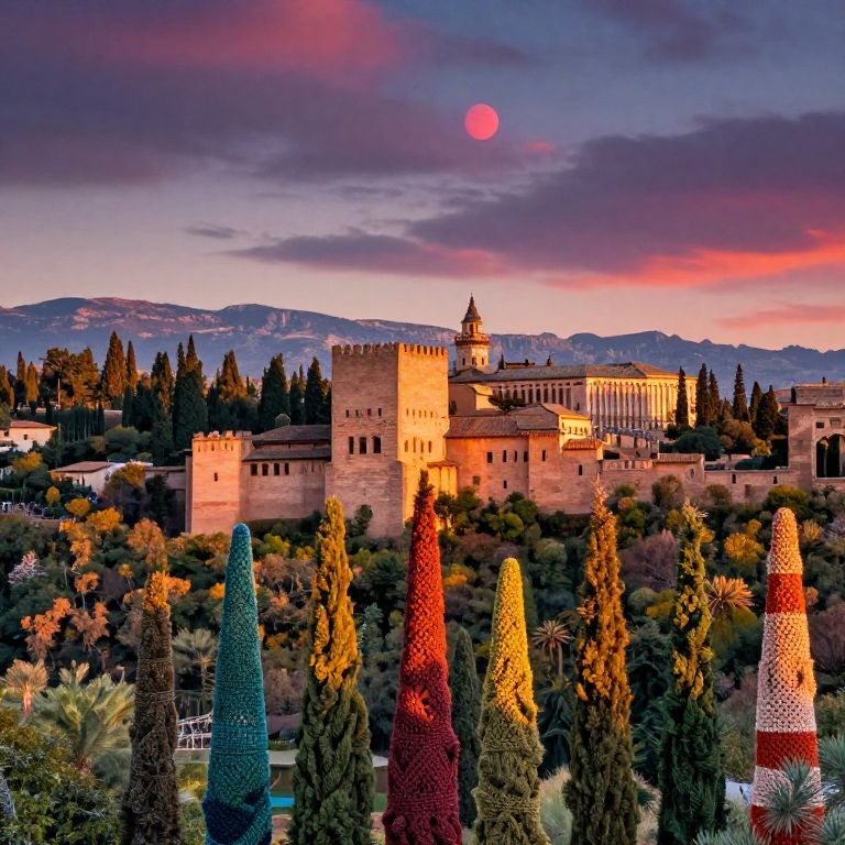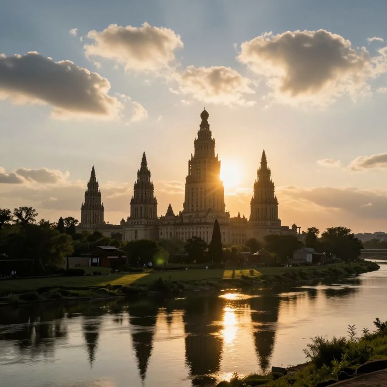 Surreal towers rise majestically above a tranquil landscape, their intricate stone structures casting long shadows as a golden sun dominates the horizon, framed by fluffy clouds and mirrored in a calm river below.