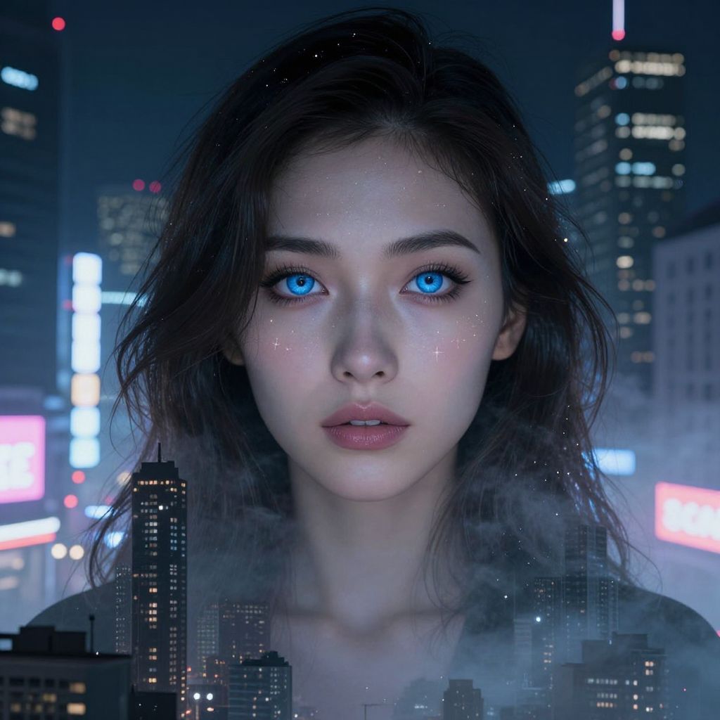 Craft a photorealistic digital portrait of an enigmatic woman with deep blue eyes mirroring the night sky over a bustling cityscape. Her hair, a cascade of moonlit fog, seamlessly blends into the dense urban smog below. Amidst glowing neon signs and towering skyscrapers, her serene expression stands in alluring contrast to the cold modernity surrounding her. As light from distant constellations glimmers in her irises, it creates a mesmerizing double exposure effect, transporting both subject and observer into a captivating realm where dreams intertwine with reality.