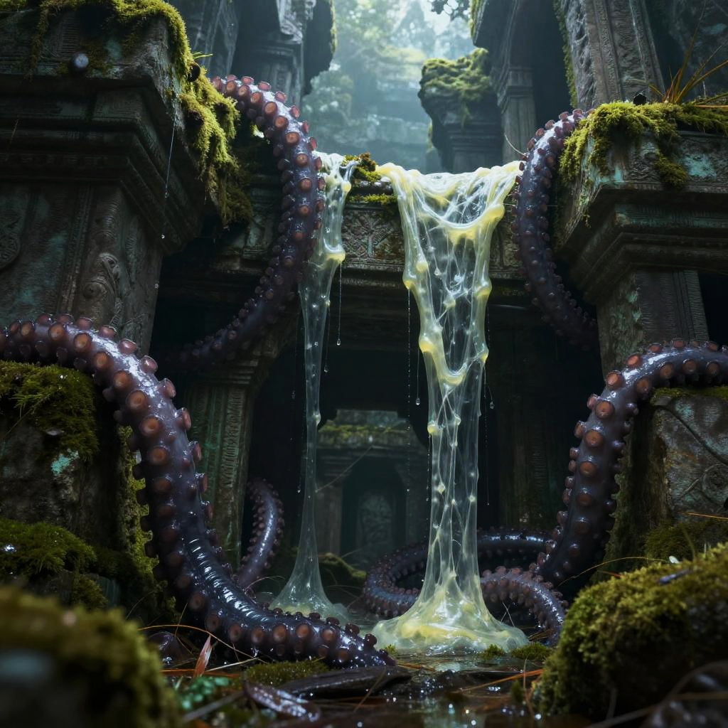 Slime tentacles wrapping around ancient ruins covered in moss, soft glowing slime dripping, atmospheric lighting, cinematic composition, fantasy environment