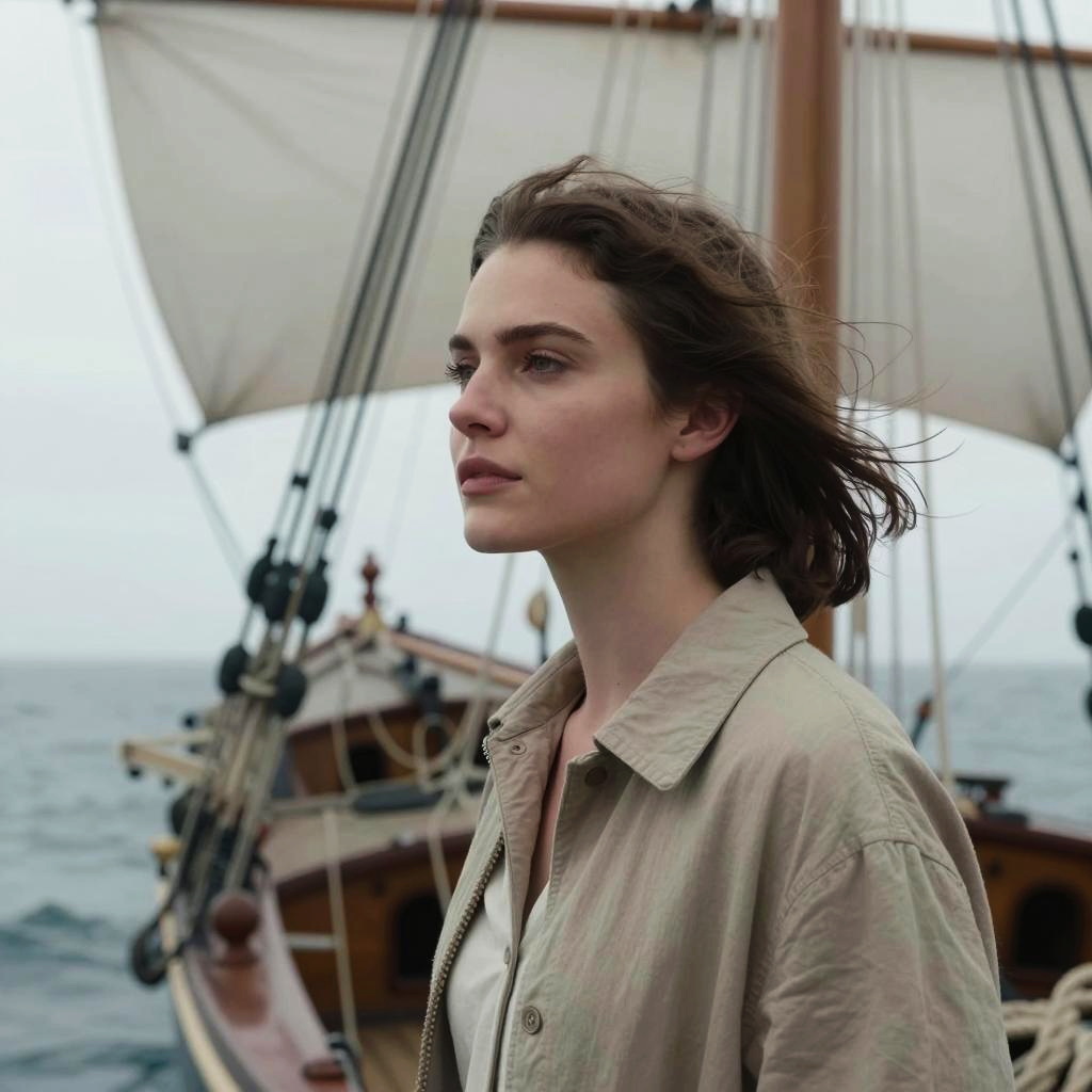 Portrait of a young woman with wavy brown hair and fair skin, wearing a beige jacket and white shirt, standing on a vintage wooden sailing ship. The background features sails, ropes, and the open sea under an overcast sky, capturing a calm and contemplative mood.
