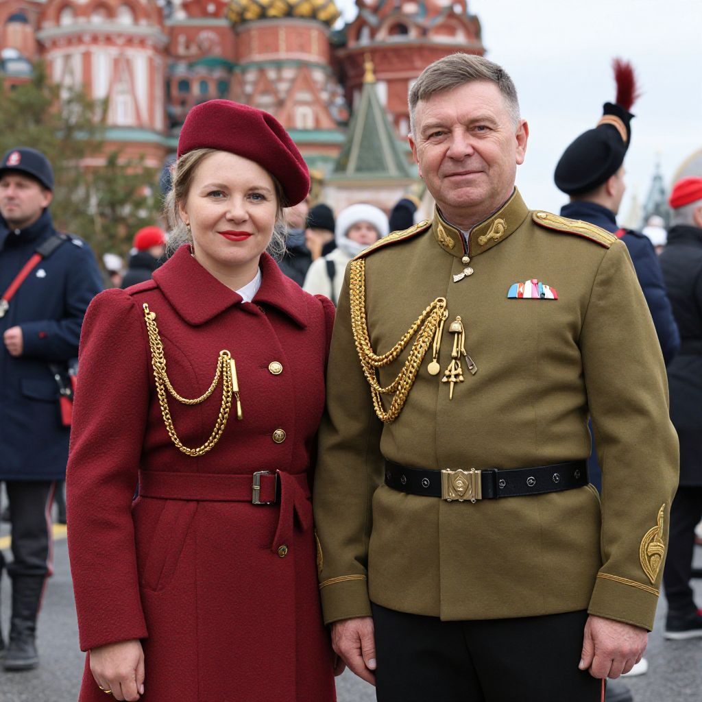 Man in ornate military uniform stands beside a woman in a red beret and coat, both smiling at the camera during Victory Day celebrations in Moscow's Gorky Park on May 09, 2019, showcasing traditional attire and ceremonial regalia.