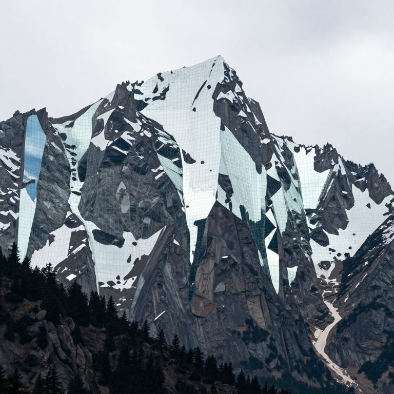 A mountain made entirely of glass mirrors reflects alternate versions of itself, each one a distorted reality where physics never existed.