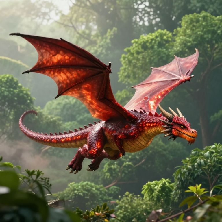 Photorealistic CGI of a vivid red dragon with large, translucent wings soaring through a lush, misty forest, sunlight filtering through dense greenery.