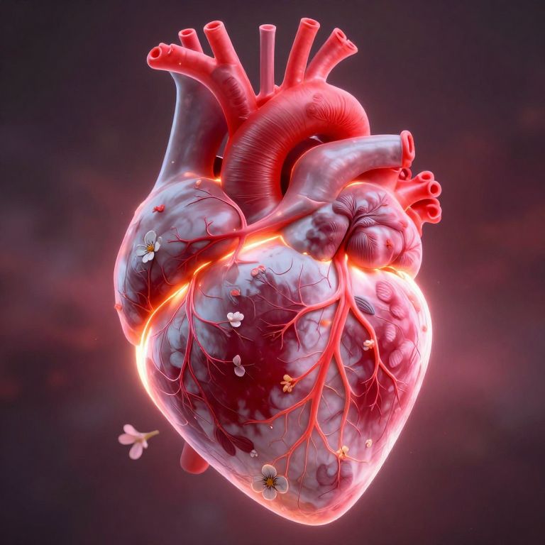 Digital illustration of a glowing, red and white heart with illuminated arteries, surrounded by a dark purple background and floating flowers.