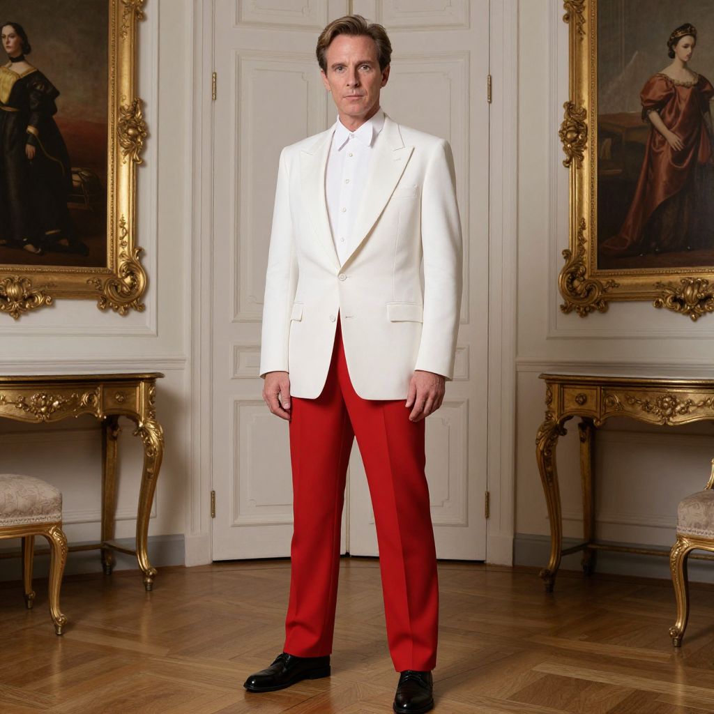 Jean Michel Frank Costume, man in a white jacket and red pants standing in a room