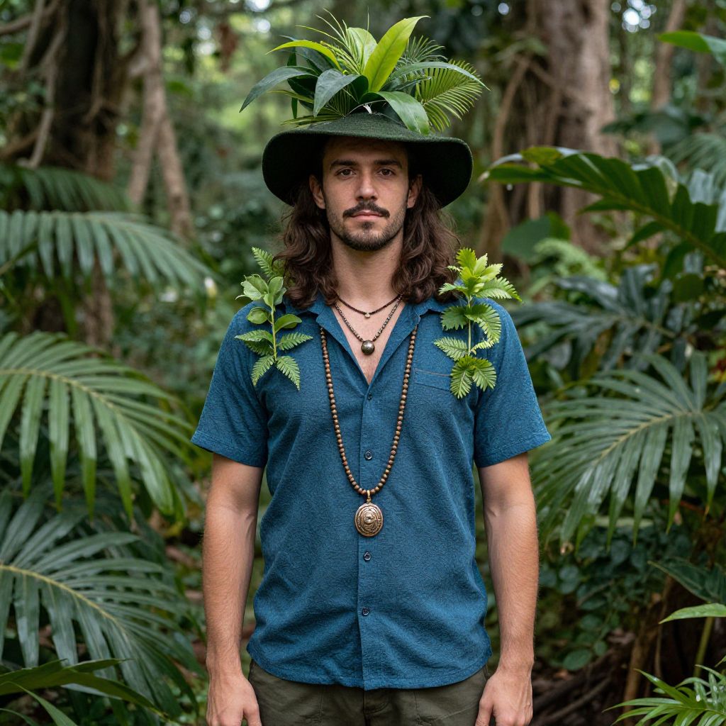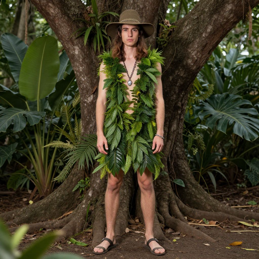 Dress jungle theme party, solo, 1boy, male focus, hat, brown hair, long hair, sandals, plant, standing, nature, necklace, tree, outdoors, jewelry, leaf