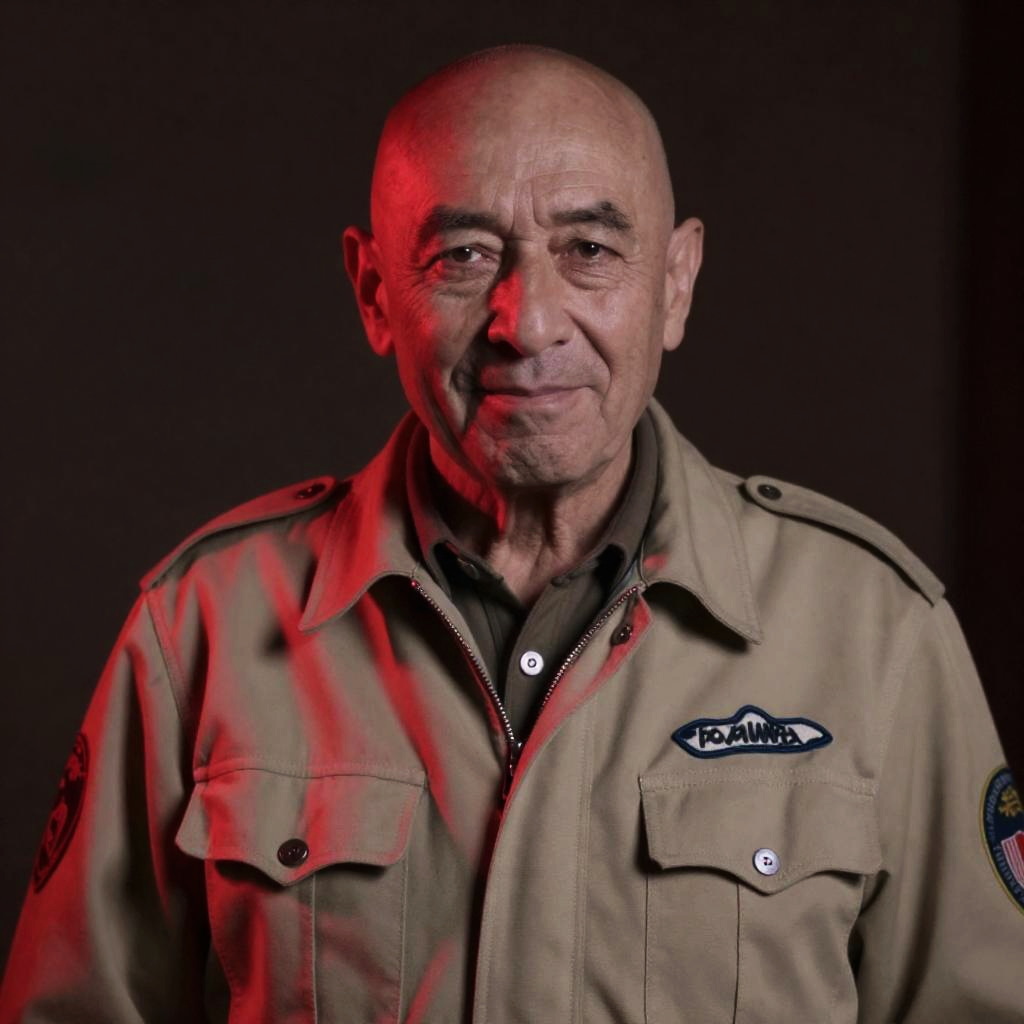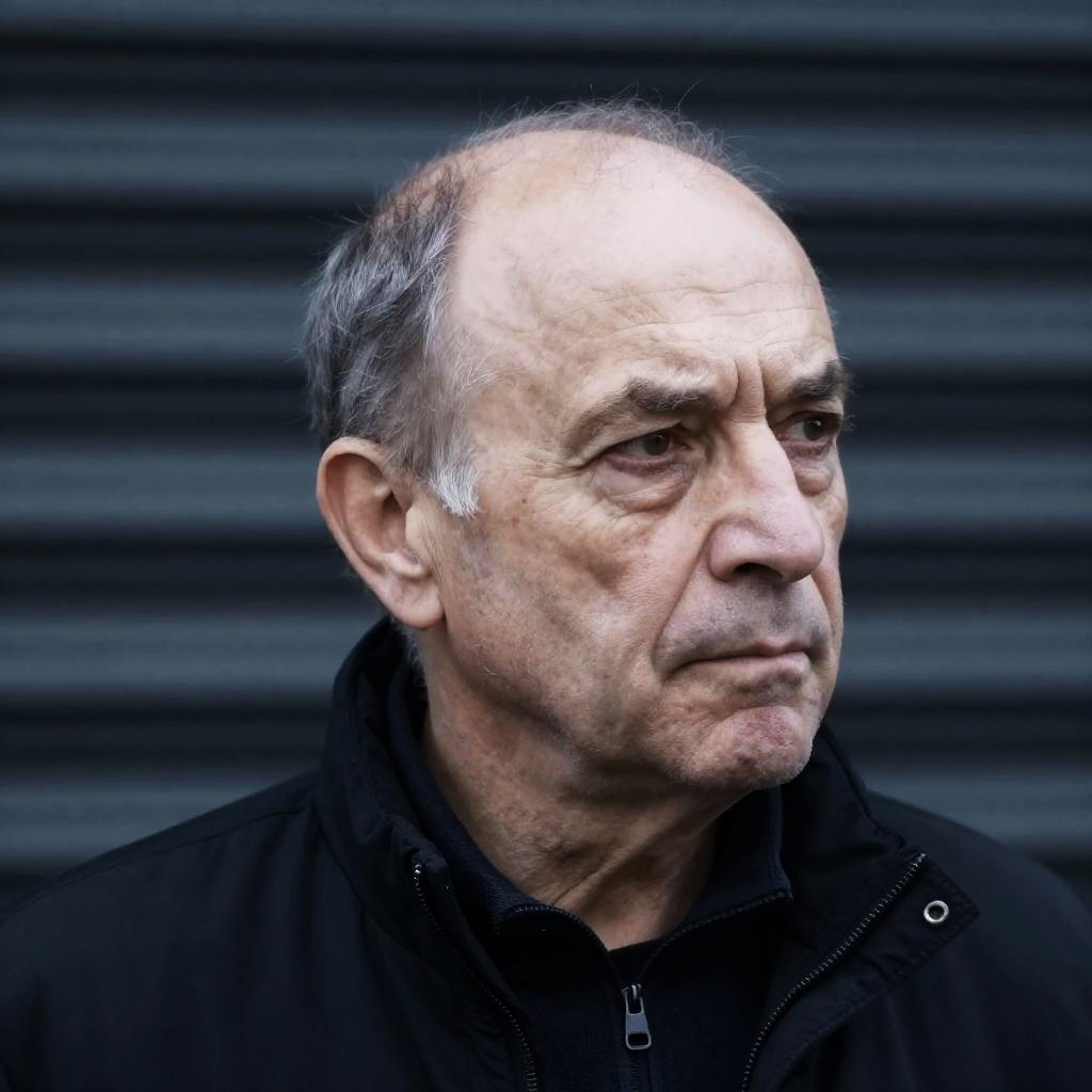 Middle-aged bald man in white t-shirt and gray pants, hands behind back, standing on gray concrete surface with red curve. Shadow on right. Intense facial expression. Single person. Sunlight from top left.