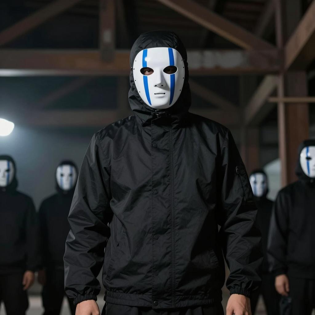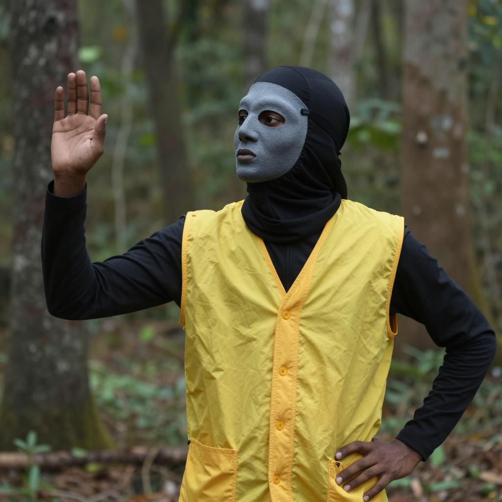 A man with dark skin wears a bright pink hooded cloak and a gold mask with prominent teeth. He raises his right hand in a gesture. Behind him, seven other people in black hoods and masks stand in a dimly lit room. The man's cloak is shiny, and he holds a wooden cane in his left hand. The man in the foreground has dark hair, partially visible on the right.