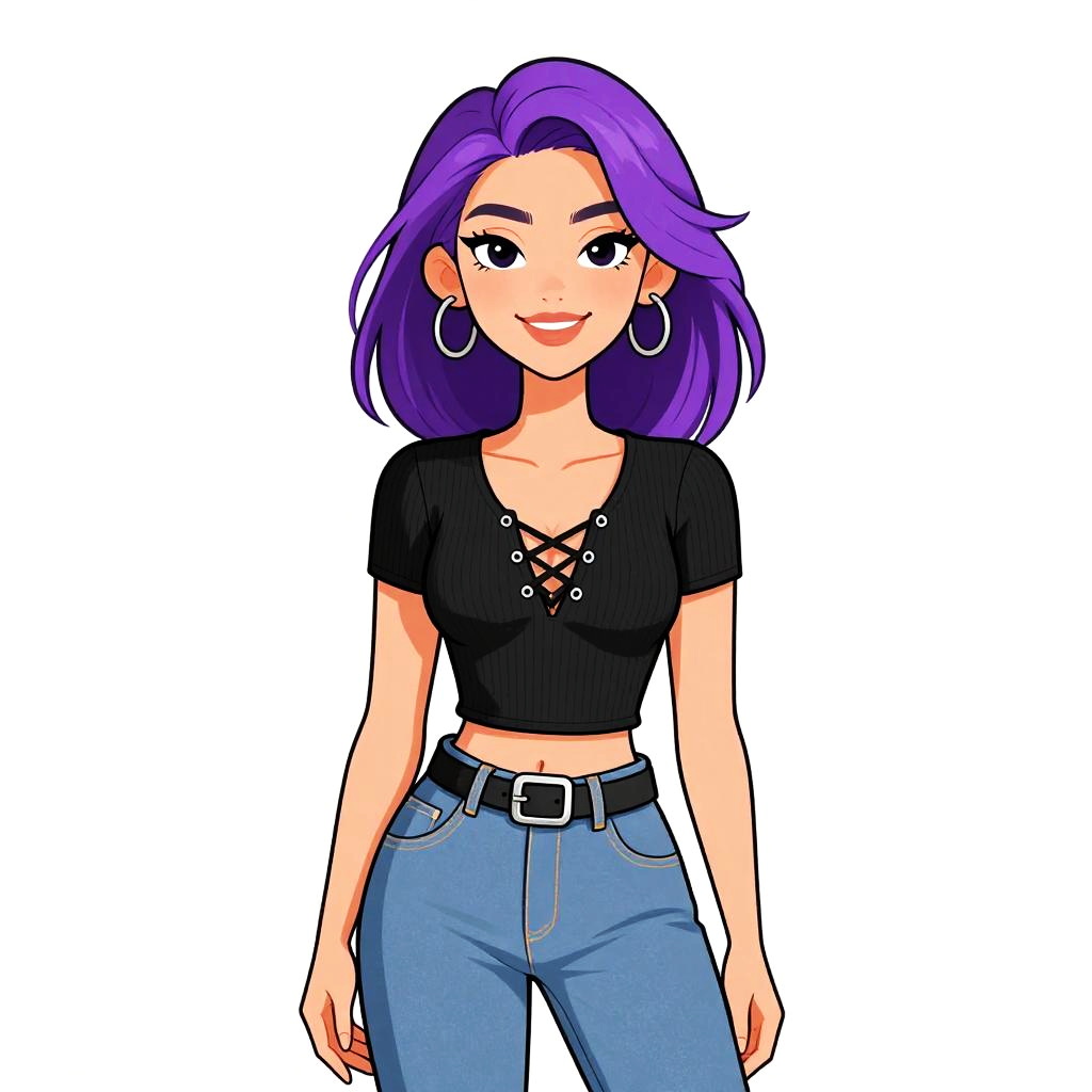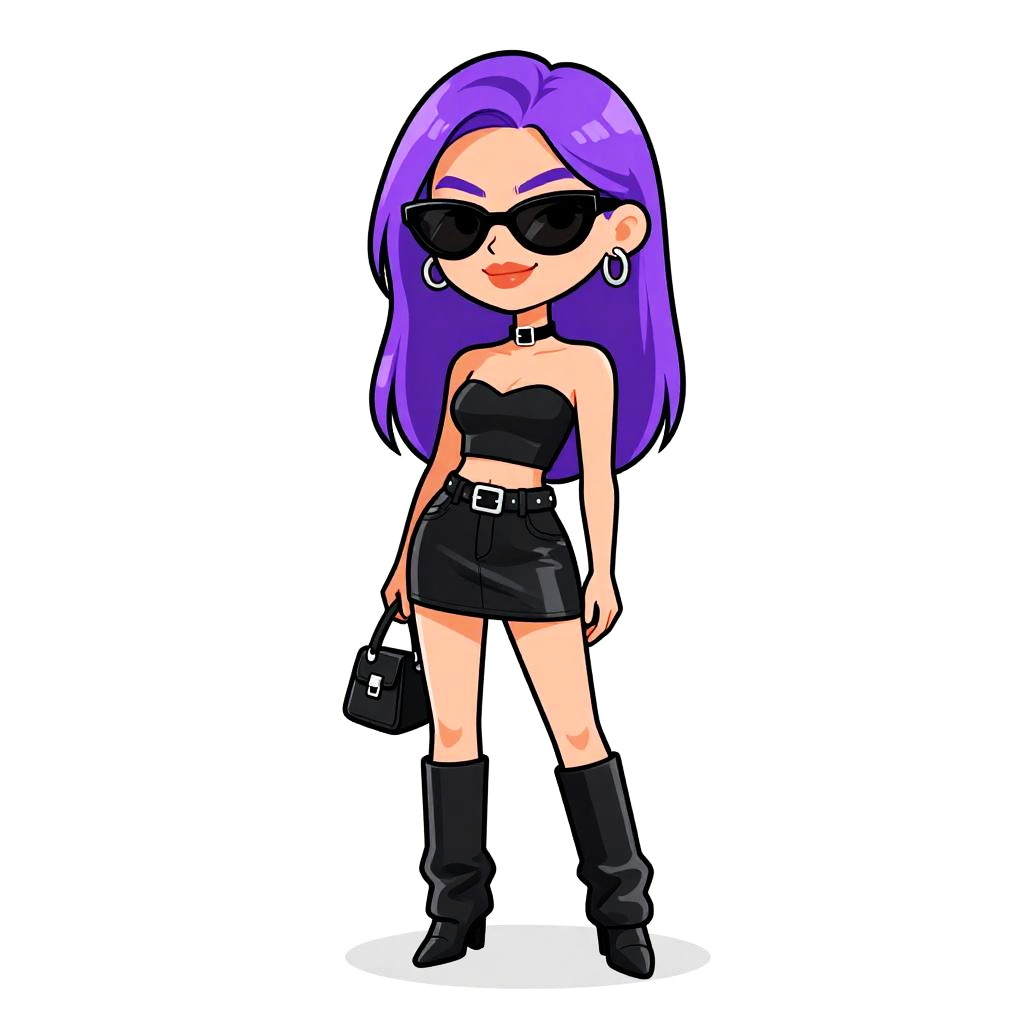 Woman with pretty face and pretty hair. smiling Woman, edgy modern, black long-sleeve crop top with front lacing, matching black micro mini skirt with drawstring side detail, high black leather boots, dark sunglasses, neutral white studio background. --sref 1467