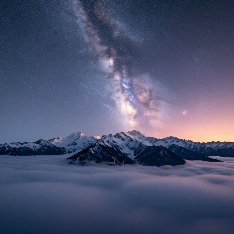 Snow-capped peaks rise majestically against a twilight sky where the Milky Way streaks across the heavens, casting an ethereal glow over a sea of clouds that seem to float endlessly below, creating a surreal boundary between earth and cosmos.