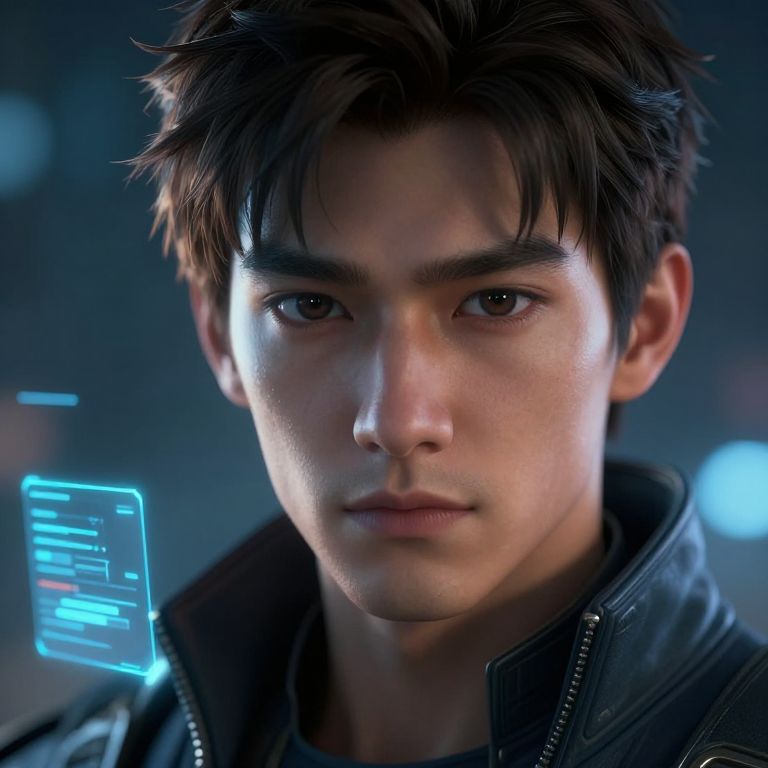 Photorealistic digital artwork of a young Asian man with short, dark brown, slightly messy hair and intense brown eyes. He has a fair complexion and a serious expression. He wears a black, high-collared jacket with a zipper. A glowing, blue holographic interface is partially visible to his left, showing lines of text. The background is a blurred, dark blue, creating a futuristic, high-tech atmosphere. The lighting highlights his face, adding depth and realism.